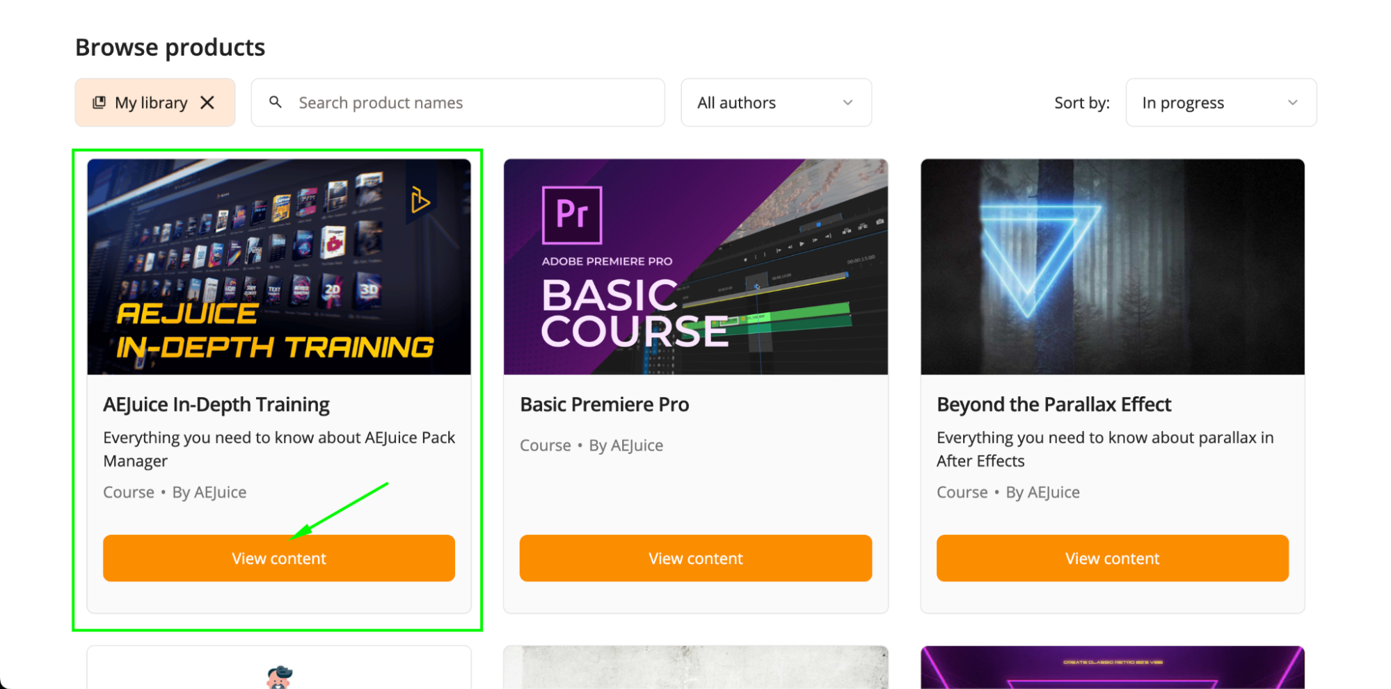 Once logged in, you’ll see your personal course library. Find the course titled “AEJuice In-Depth Training” and click the View Content button to open it.