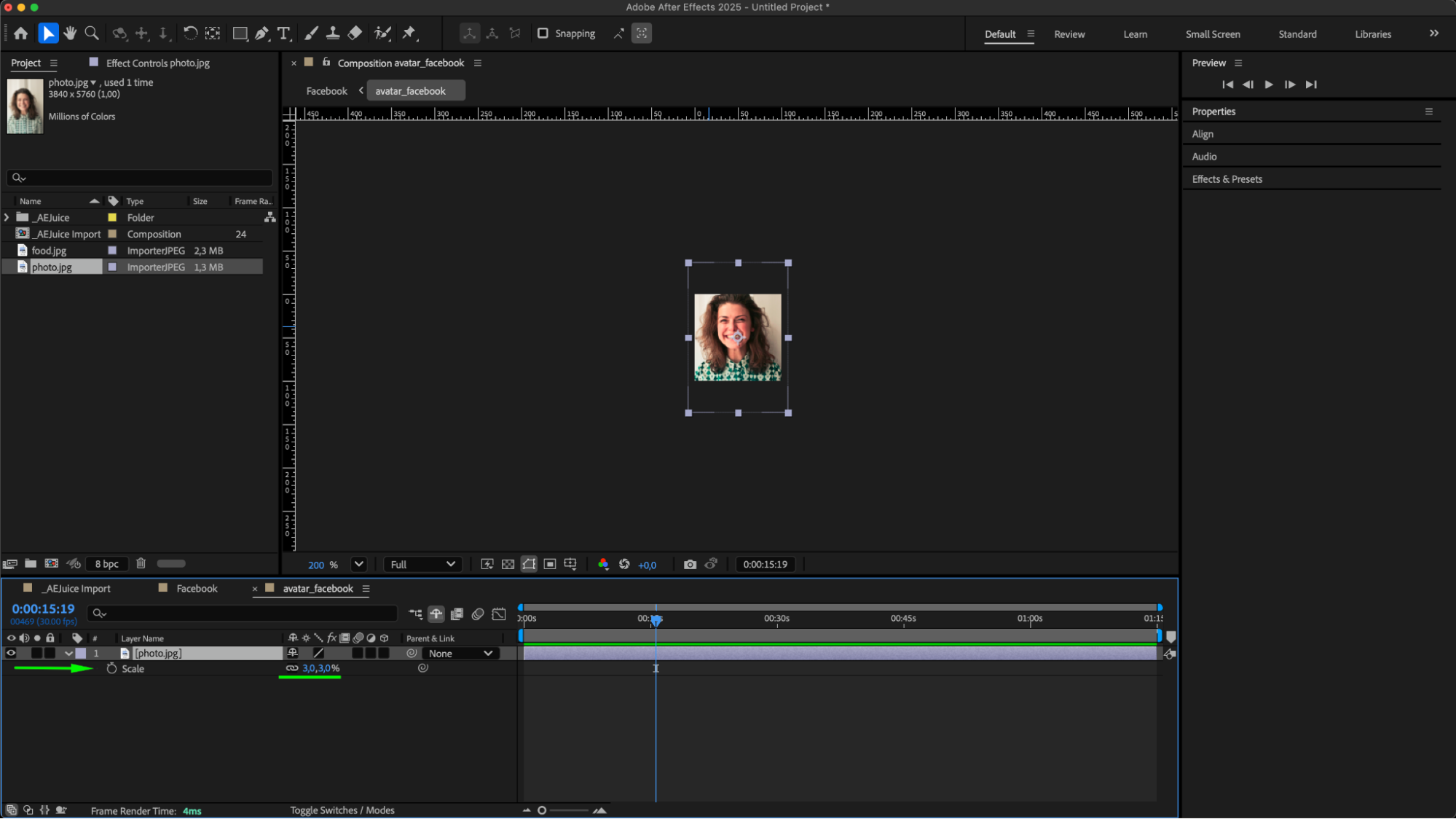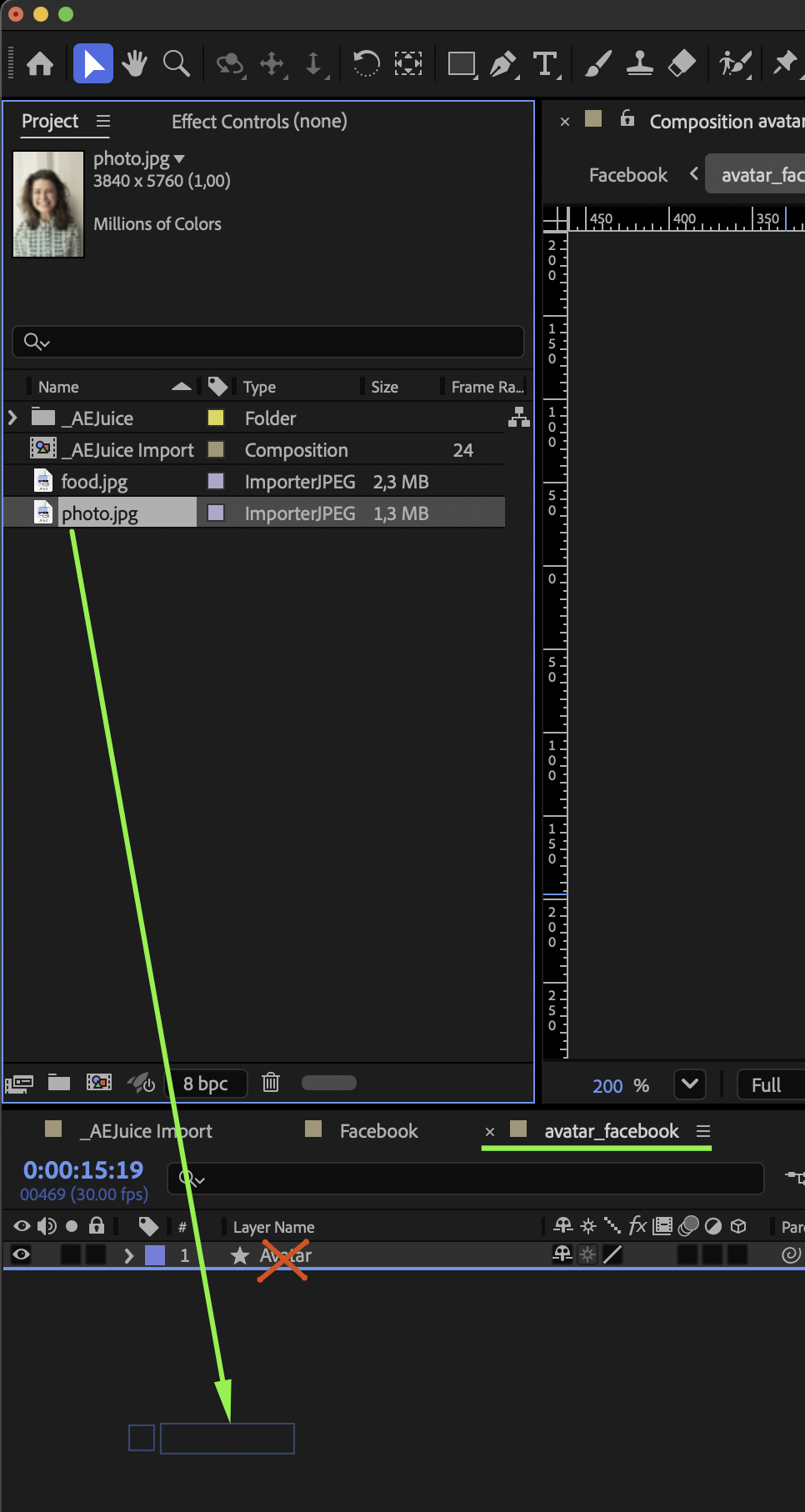 To add your own photos or images into the composition, first go to File > Import > File and import your images into the Project panel. Then, double-click on the specific image composition (for example, Avatar Facebook or Image) to open it. Inside the composition, delete the placeholder image and drag your imported photo from the Project panel into the comp. Adjust the scale and position as needed to fit the design.