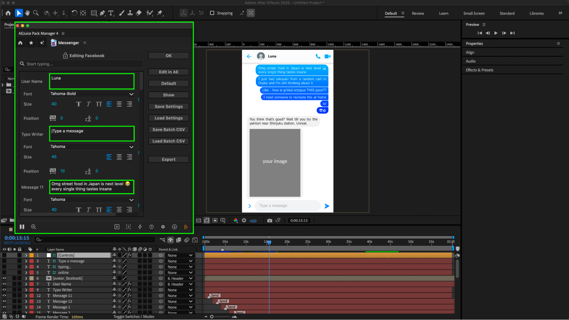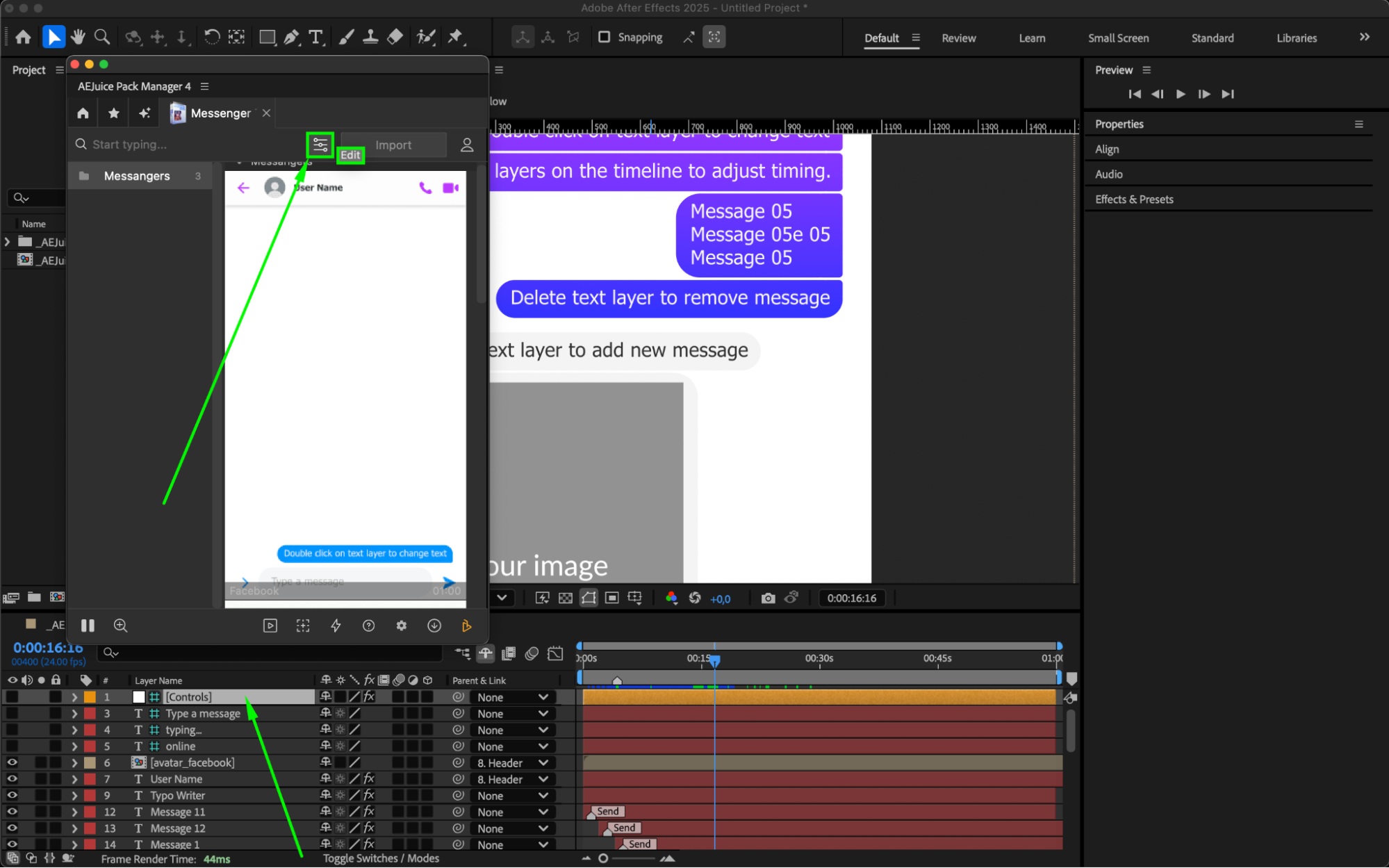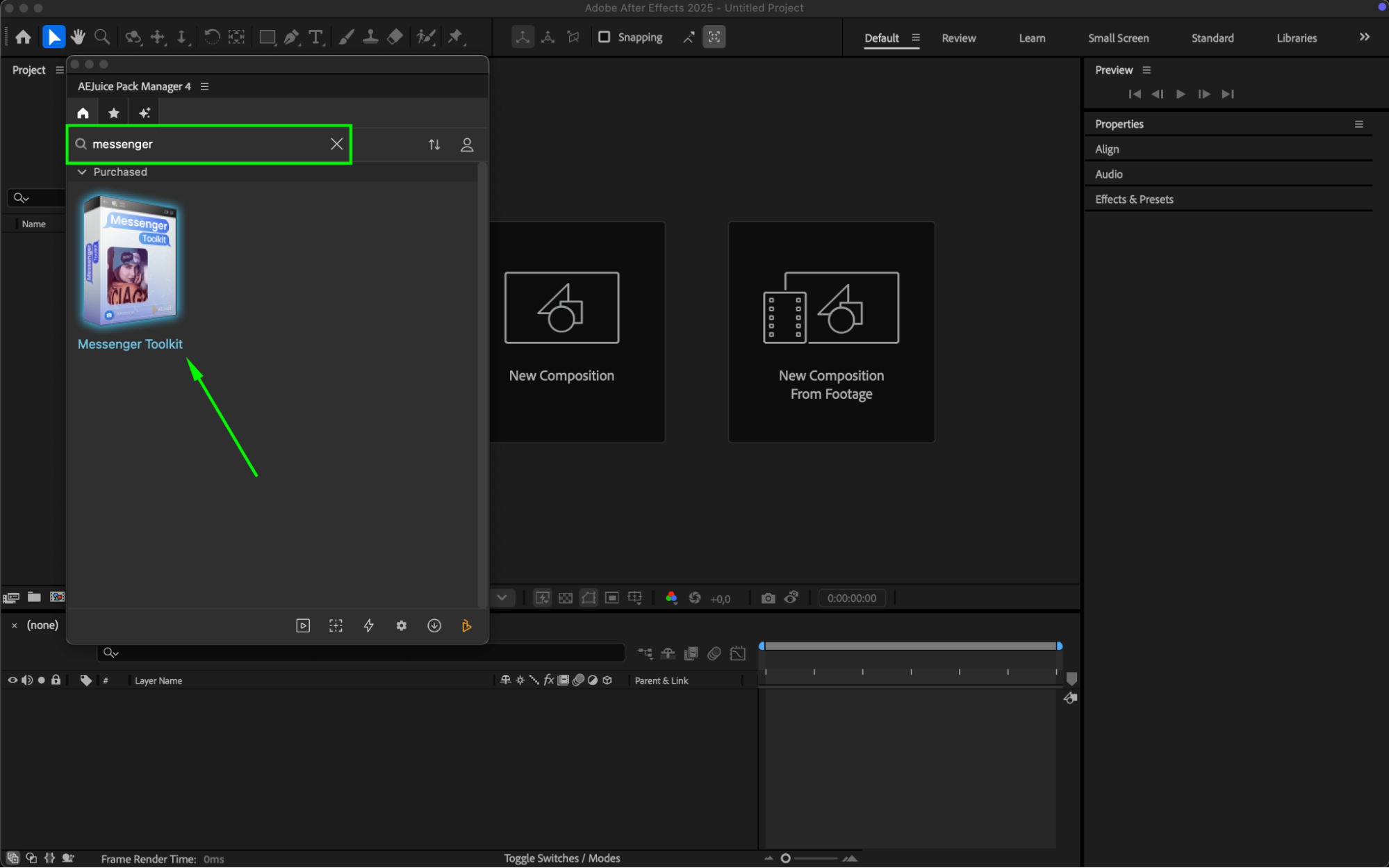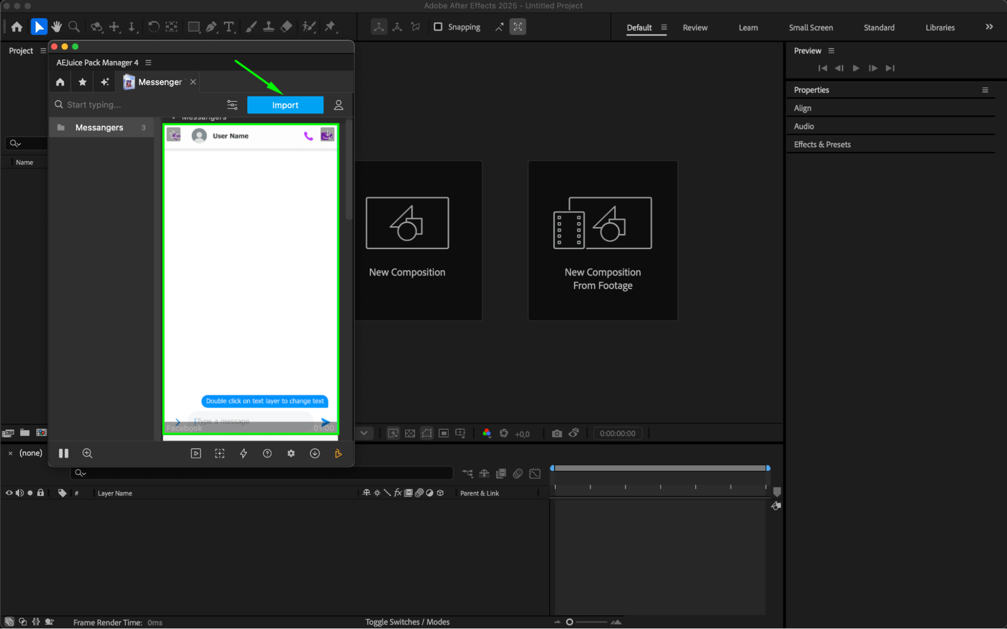 In After Effects, go to Window > AEJuice Pack Manager 4. This will open the plugin panel, where you can access all installed AEJuice packs or explore new ones like the Messenger Toolkit.Step 2: Download the Messenger Toolkit Pack