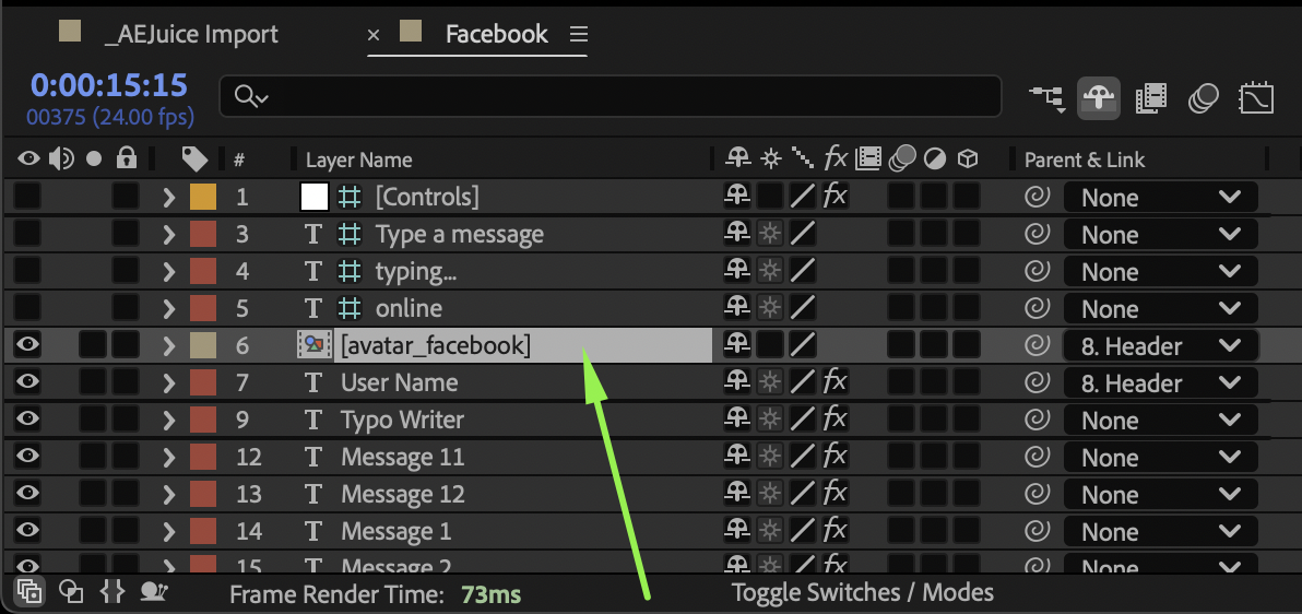 In your timeline, just below the Controls pre-comp layer, you’ll see multiple layers that represent each message in the chat.