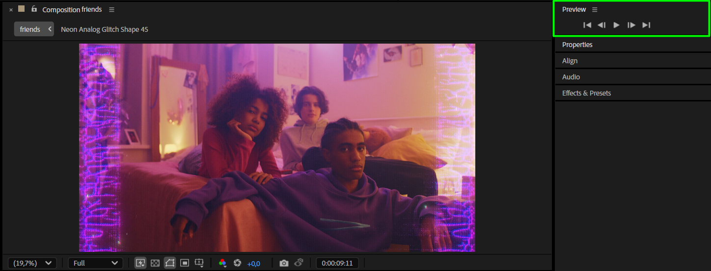 Go back to your main composition and press Spacebar to preview. Make any final tweaks to timing, positioning, or blending. You can also duplicate the glitch shape layer for more intense effects or sync them with music beats.