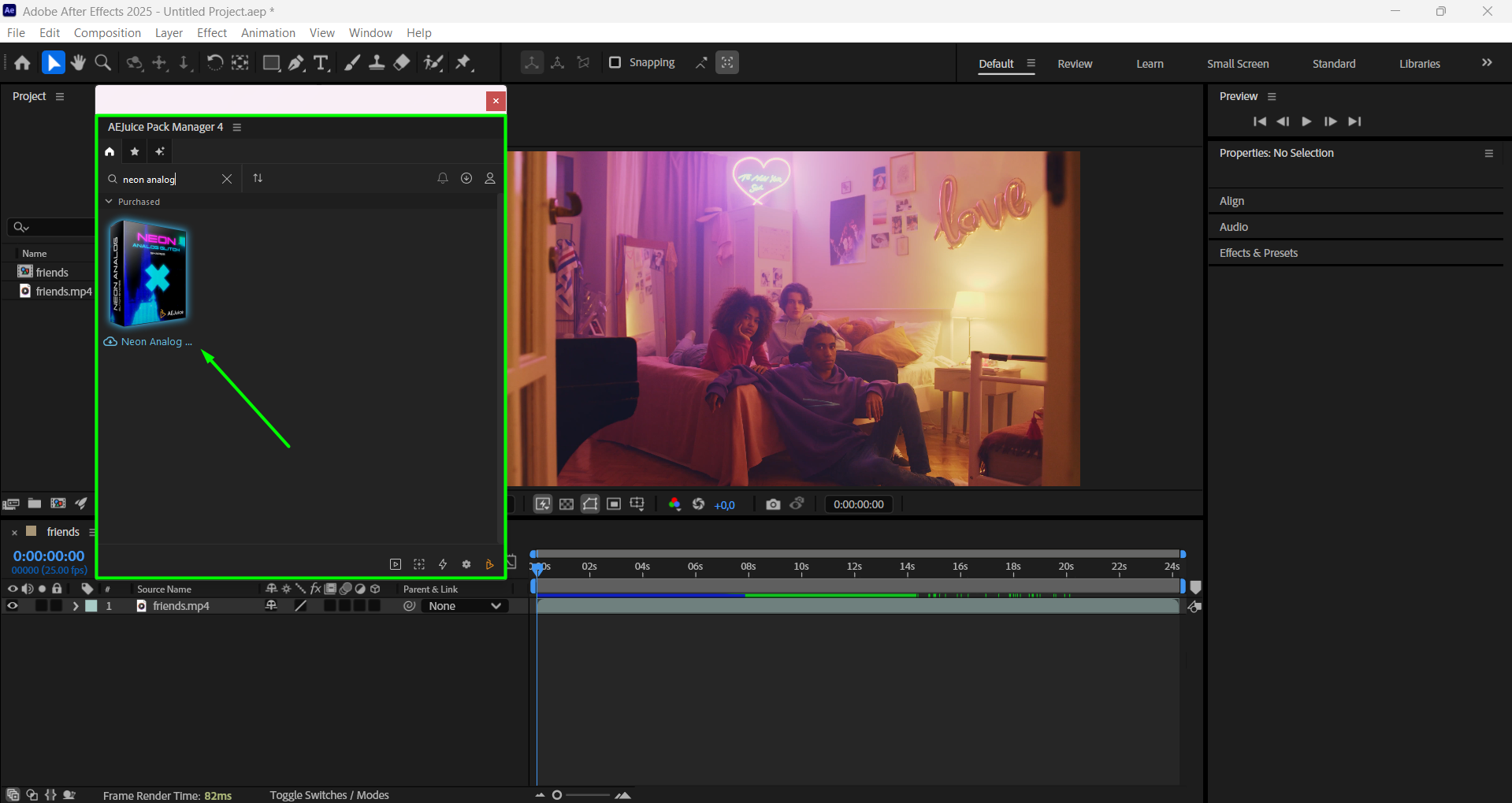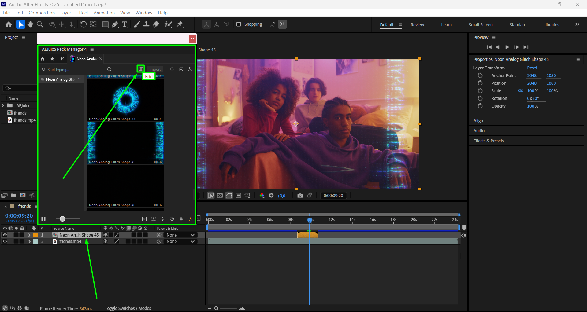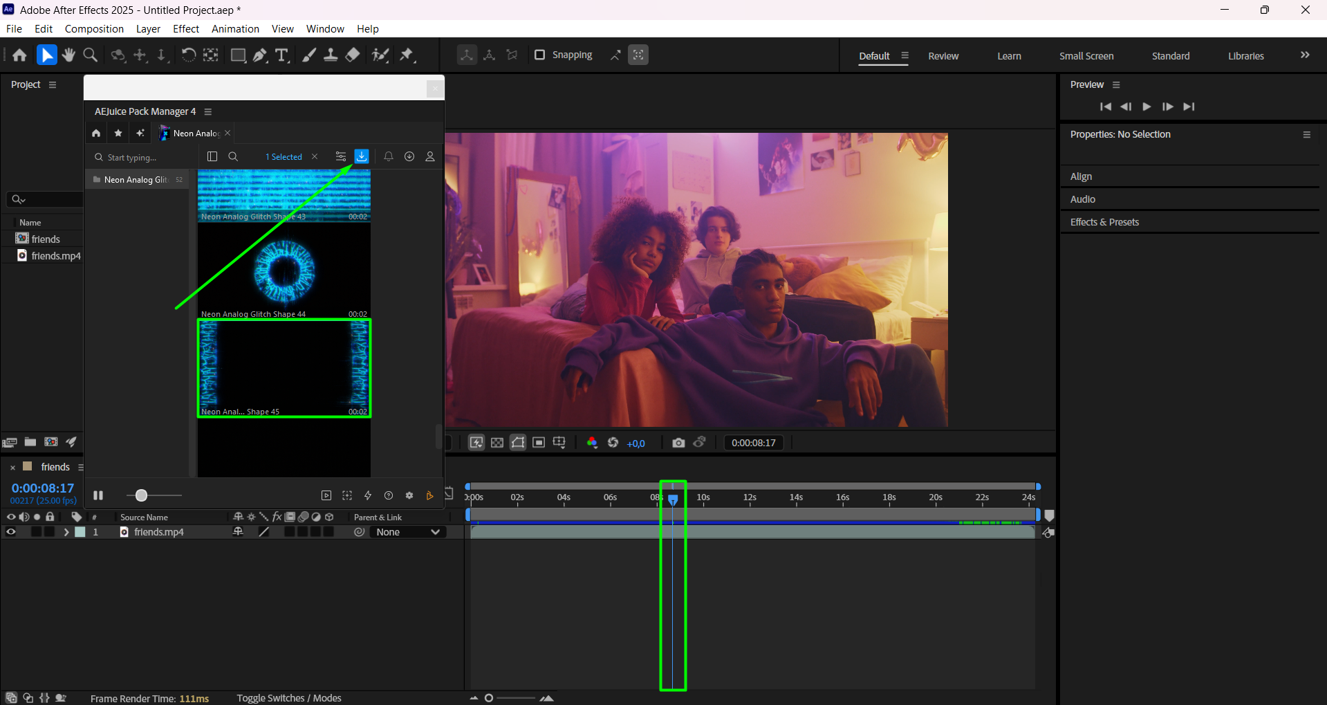 Scroll through the Pack Manager until you find Neon Analog Glitch Shapes. Click to download the pack if it isn’t already installed. Once downloaded, all included animations will be available for use.Step 4: Choose and Import an Animation