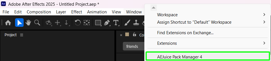 Open AEJuice Pack Manager 4 by going to Window > AEJuice Pack Manager 4. This panel is where you can browse, install, and apply all AEJuice packs, including glitch overlays.