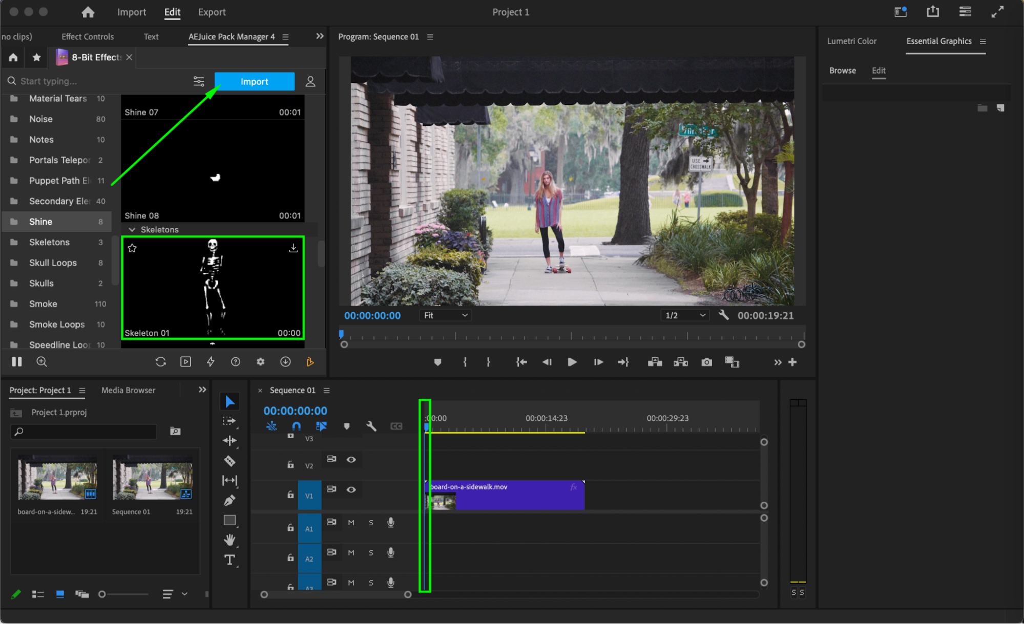 Browse through the available 8-bit animations or overlays and pick one that fits your creative vision. Make sure your playhead is placed where you want the effect to begin. Click on the effect and press Import to add it to your timeline.