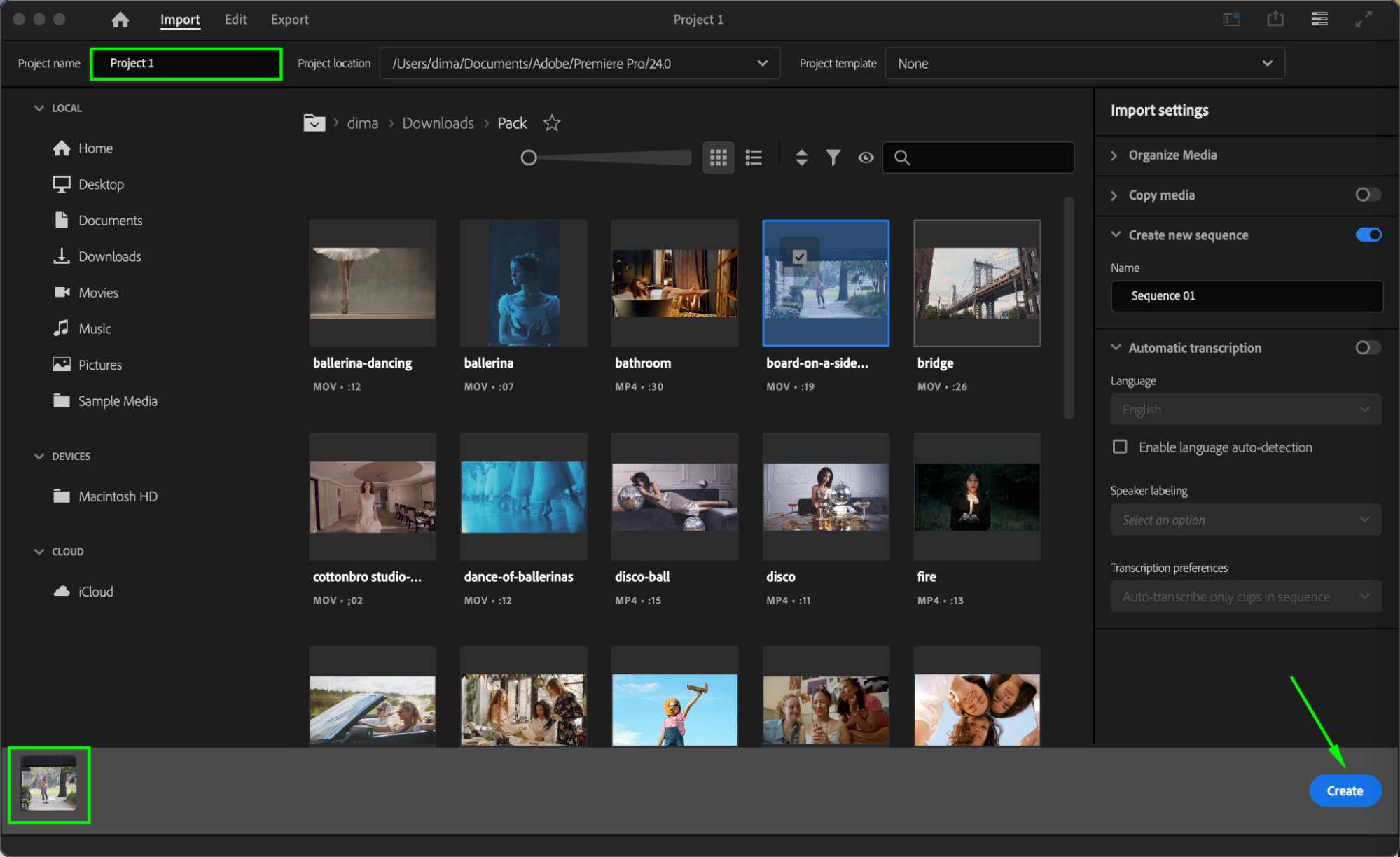 Open Premiere Pro. In the welcome screen, enter your Project Name, select your footage for import, and press Create. This will launch your timeline and workspace.