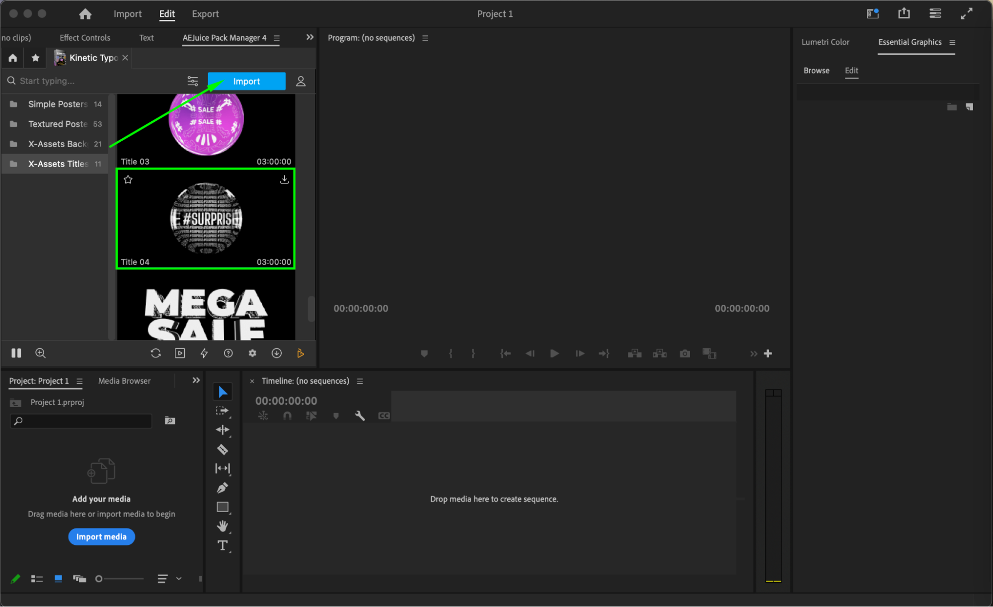 Browse through the pack and preview the available typography templates. Make sure your playhead is placed at the point in the timeline where you want the animation to appear — or you can import the template into a new, empty sequence. Click on the template you like and press Import to add it to your timeline.