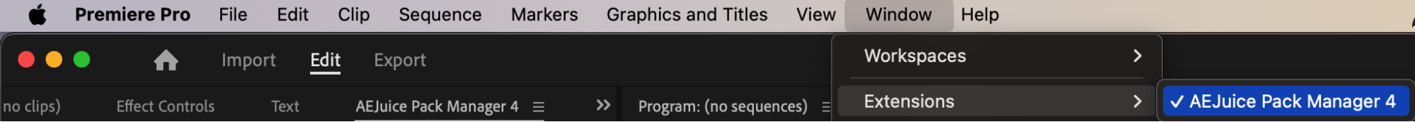 Navigate to Window > Extensions > AEJuice Pack Manager 4 to open the AEJuice plugin panel. This is where you can access all installed AEJuice packs, including typography templates, transitions, effects, and more.