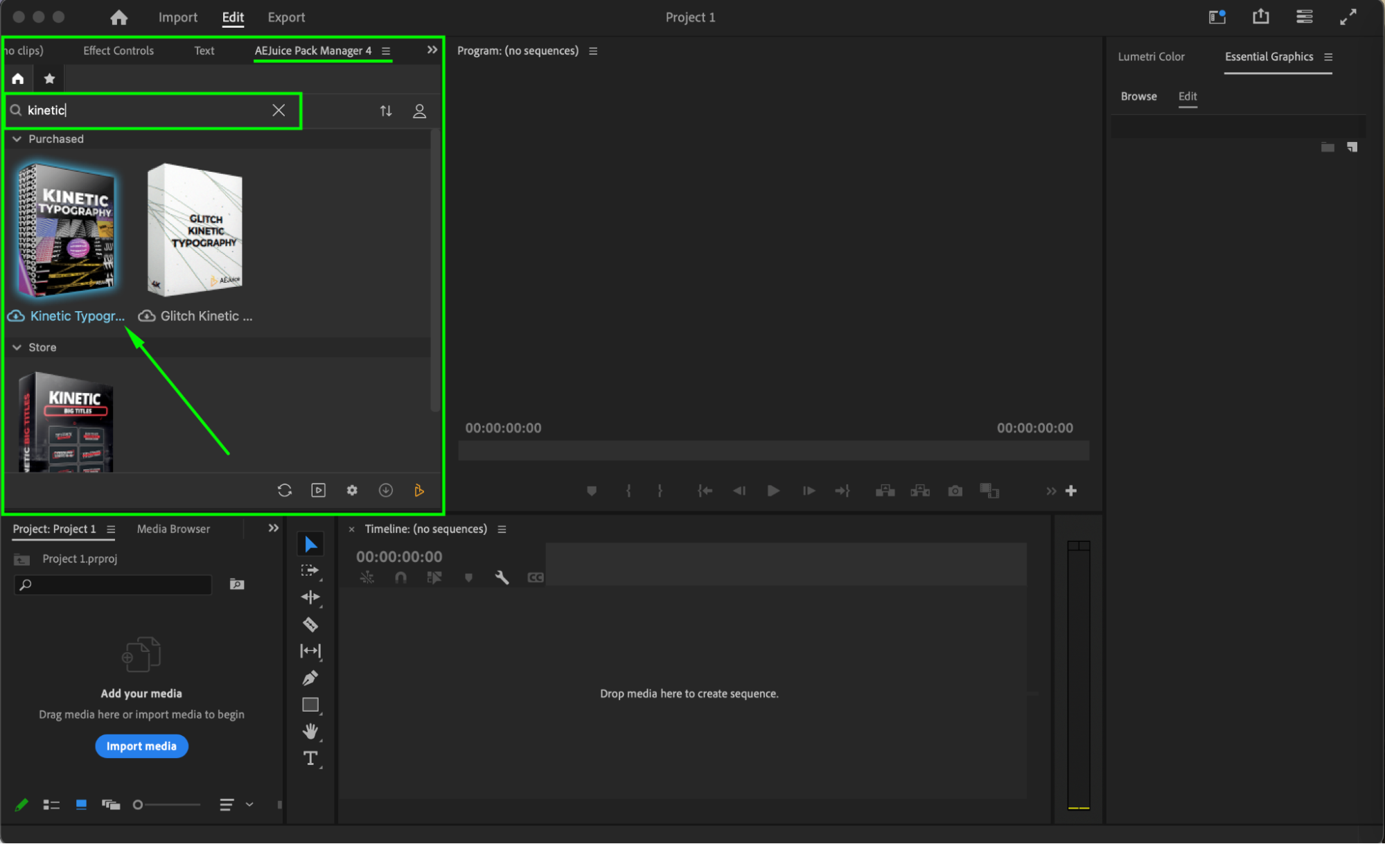 Inside the Pack Manager, find the Kinetic Typography pack. If it’s not yet downloaded, click the Download button. Once it’s installed, you’ll be able to preview and use dozens of animated text templates.