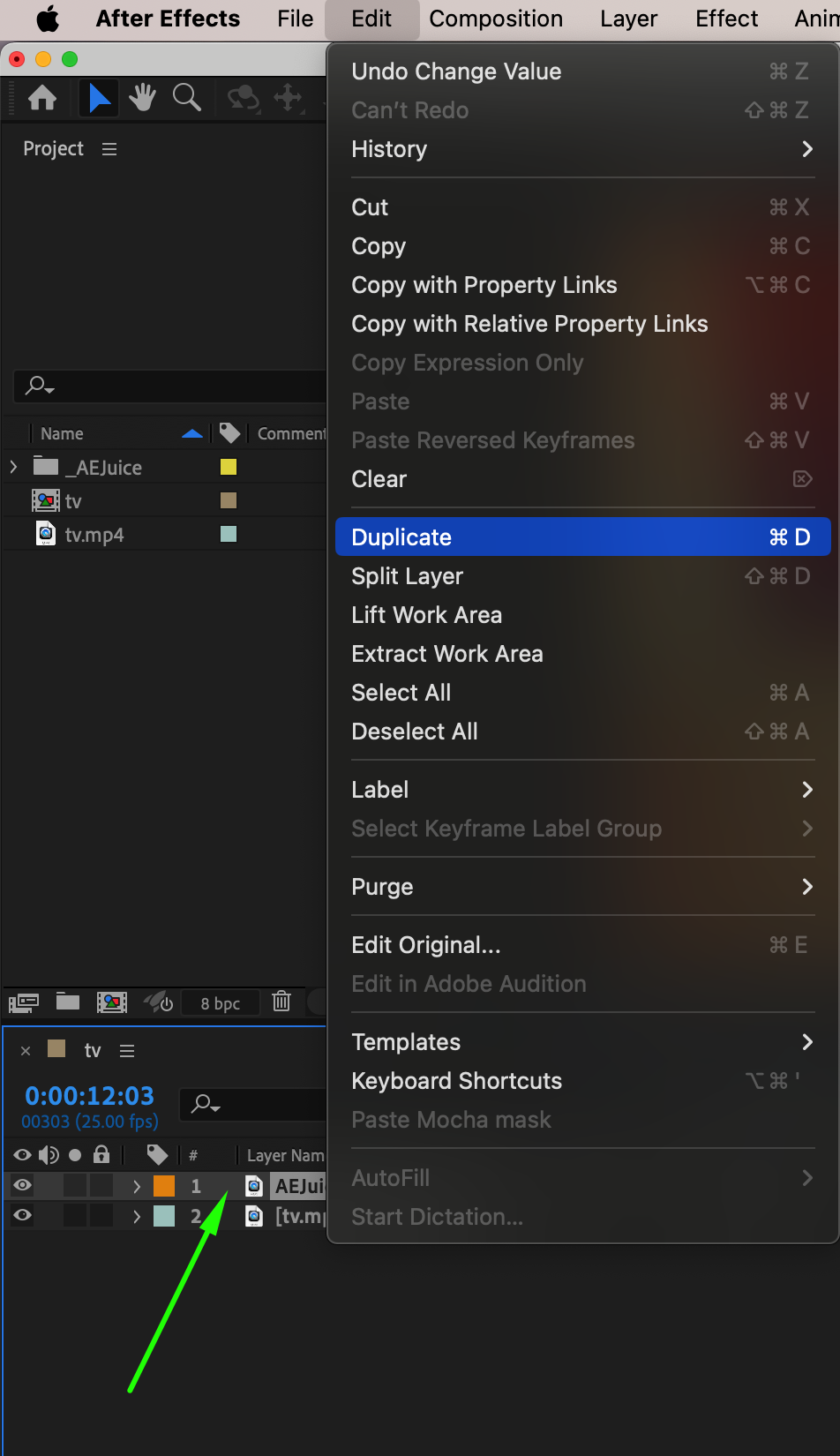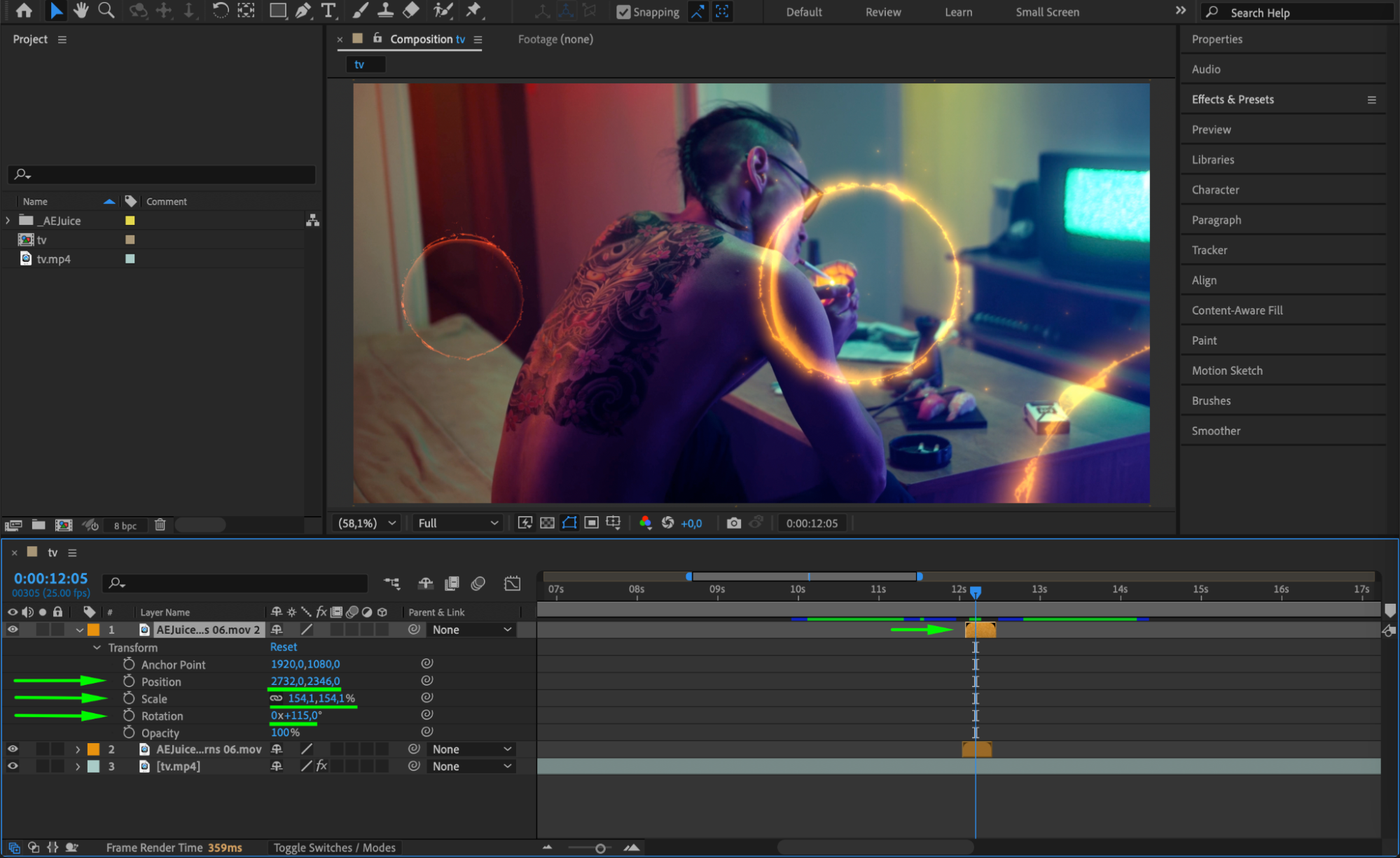 To fine-tune the effect, select the imported pre-comp layer in the timeline. You can duplicate it for extra intensity, or adjust the scale, position, and rotation using the Transform controls. You can also move it along the timeline to match a specific moment in your footage — like the end of a scene or transition point.