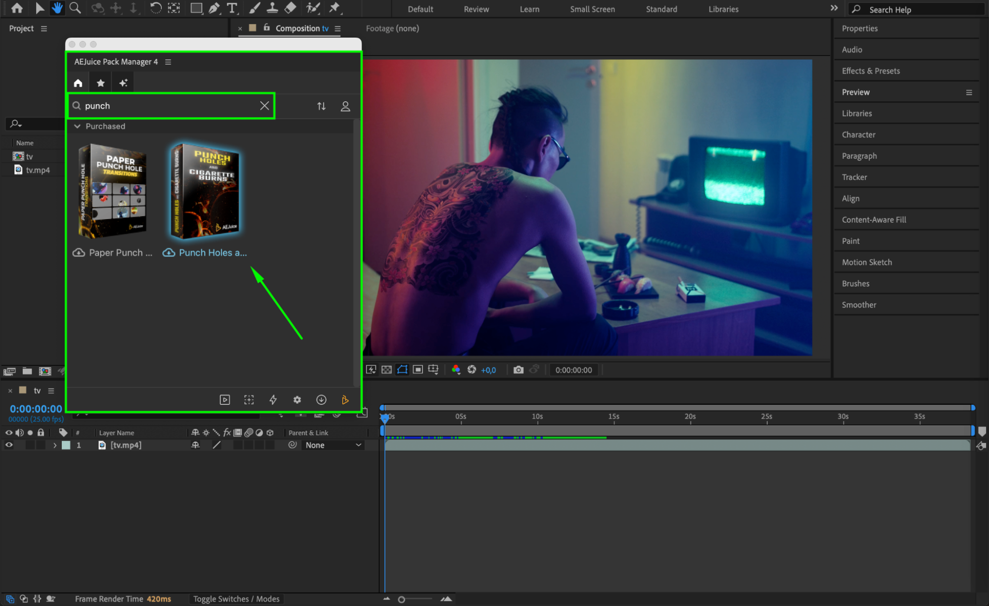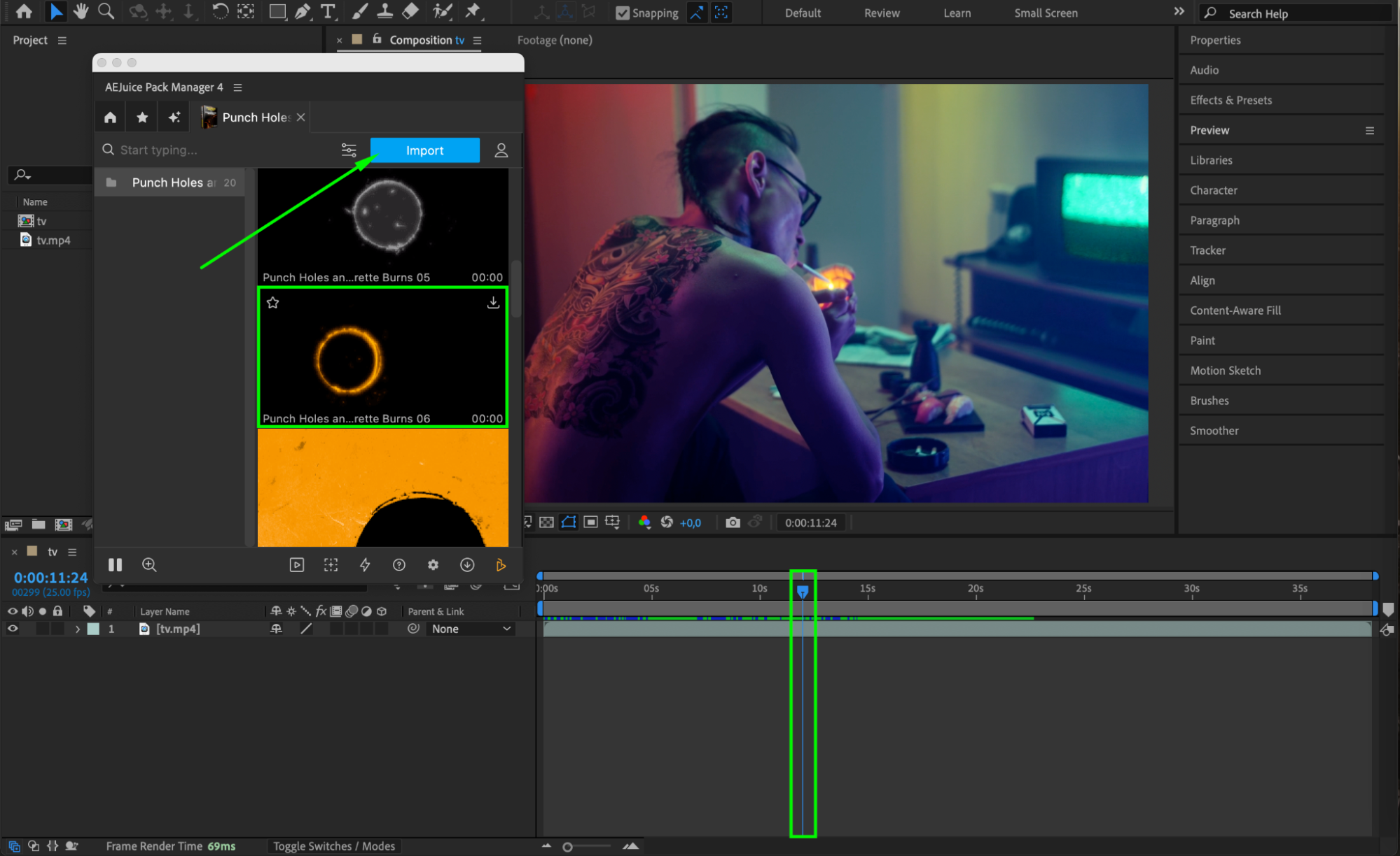 To access the AEJuice overlays, go to Window > AEJuice Pack Manager 4. This will launch the plugin panel, where you can browse, preview, and import a variety of packs. Make sure you are logged in to your AEJuice account to access all available content.Step 3: Download the Punch Hole and Cigarette Burns Pack