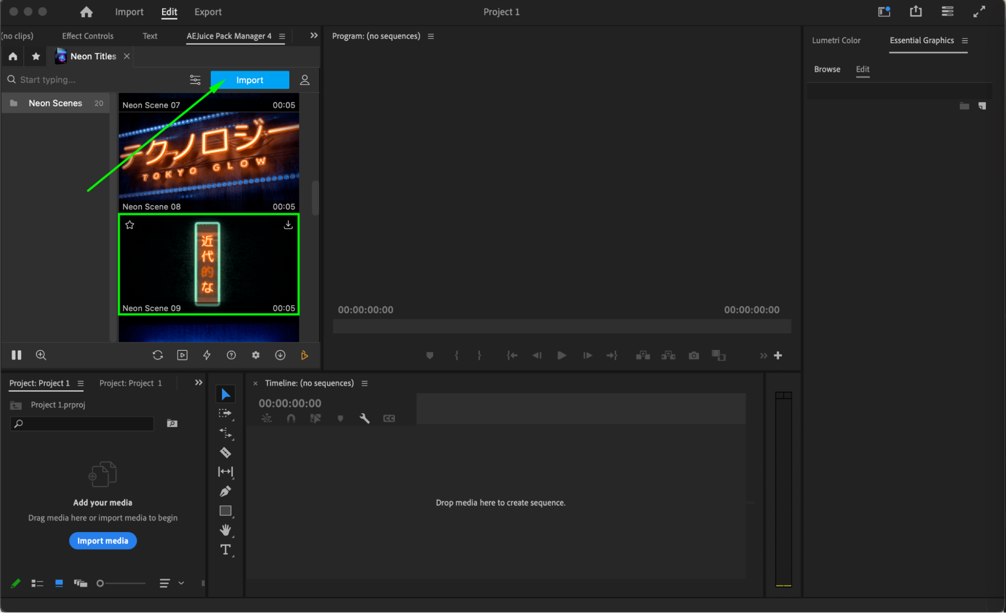 Browse through the available neon title designs in the pack. When you find one you like, click on it and press the Import button. The title will be automatically added to your Premiere Pro timeline, scaled to your sequence size.Step 4: Customize the Title Design
