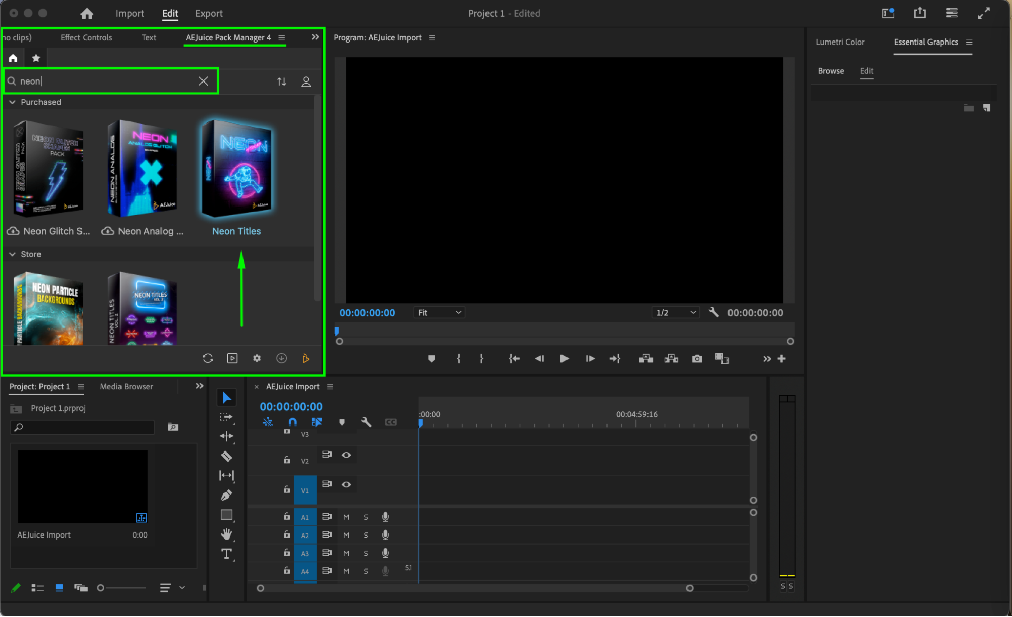 Inside AEJuice Pack Manager, scroll or use the search bar to locate the Neon Titles pack. Click on it to download if it’s not already installed. Once downloaded, the pack will be ready to use.