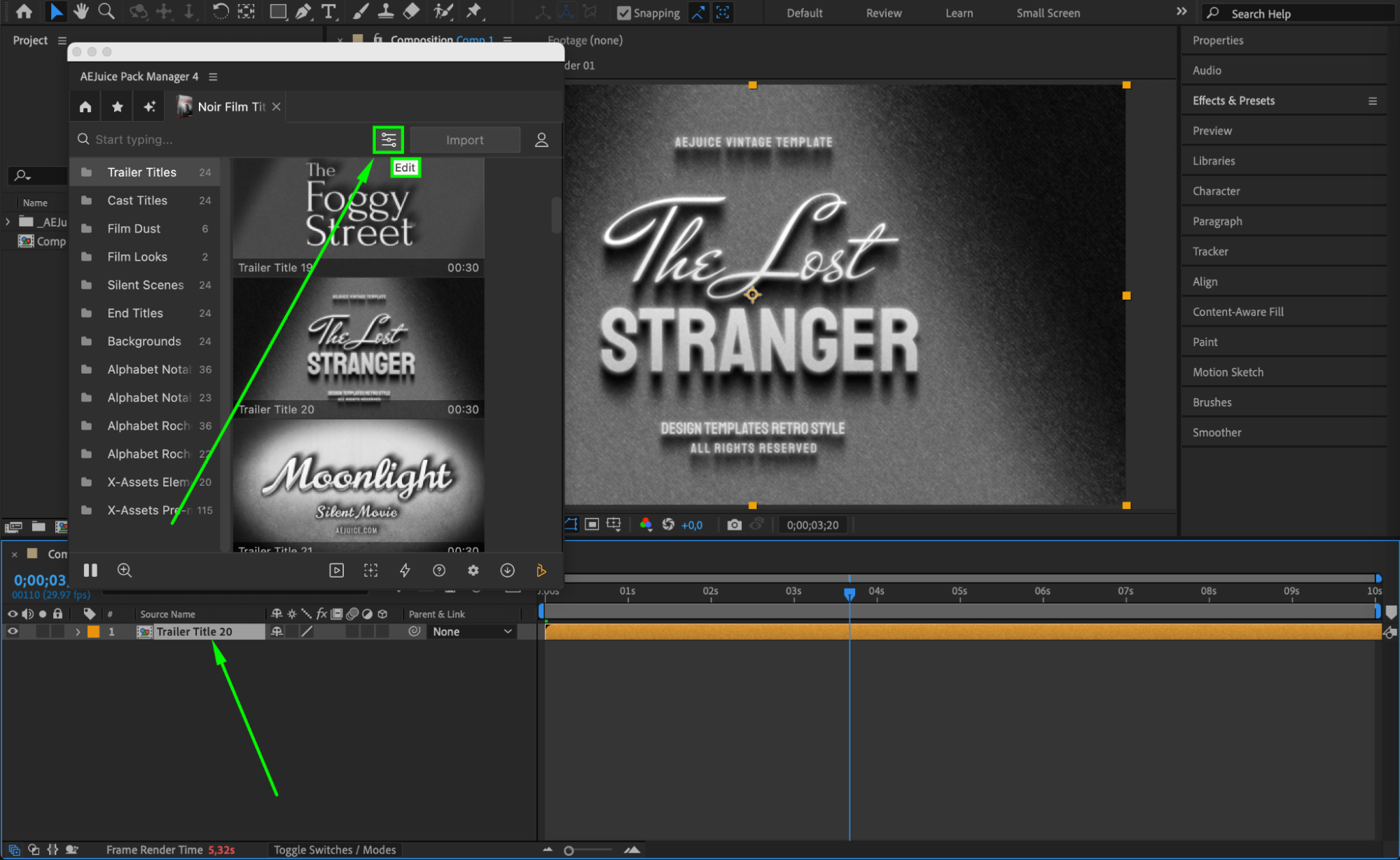 By following these steps, you can easily create stylish noir intros using pre-made templates from the AEJuice Noir Film Titles Pack. These cinematic titles are ideal for classic video projects, short films, trailers, or any scene that needs a bold, dramatic intro.