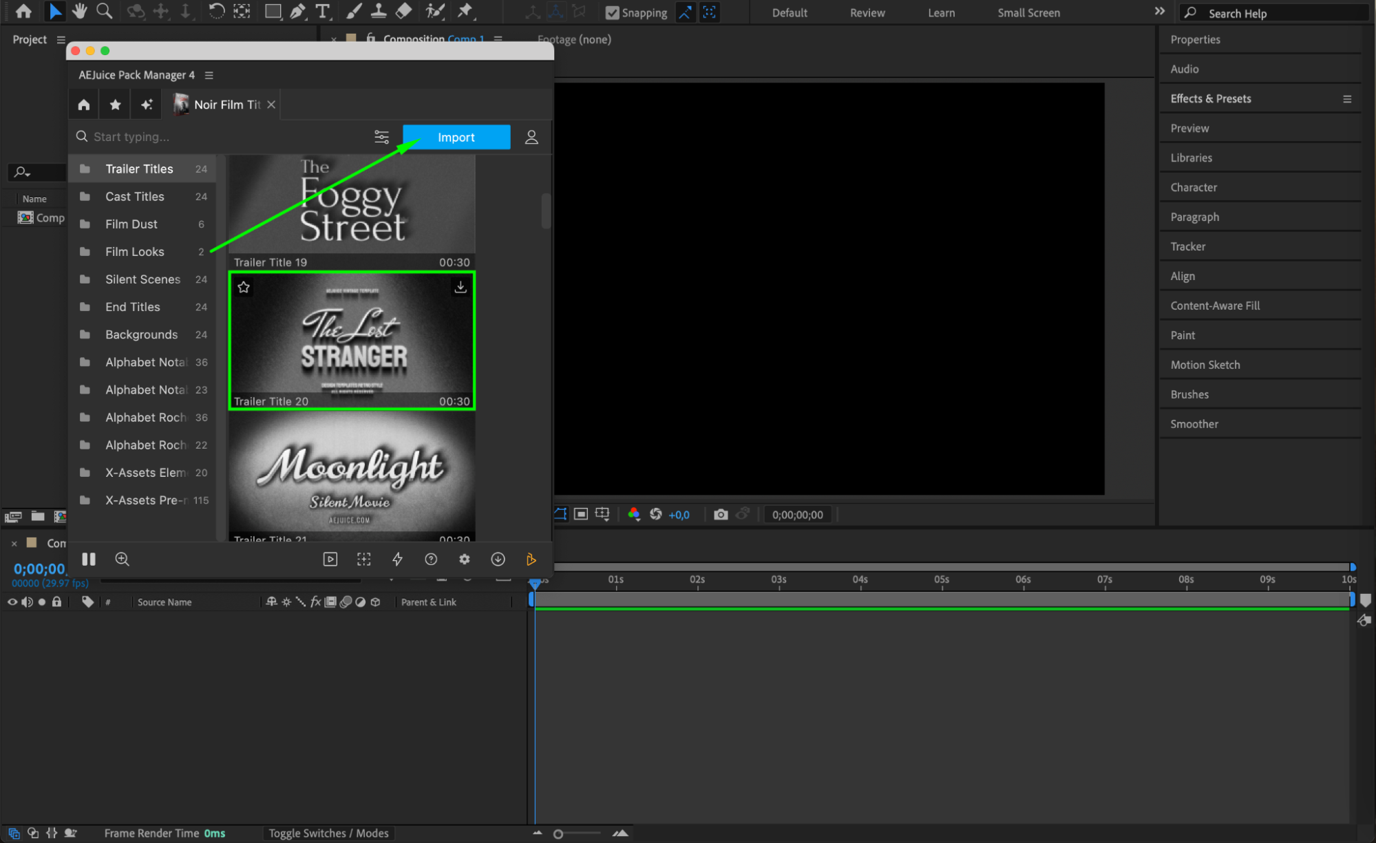 Scroll through the noir title templates and choose the one that matches the mood of your project. Click on it and press Import. It will be added to your timeline as a pre-comp.