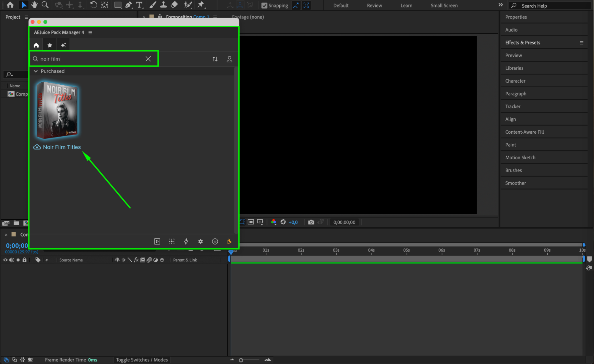 Inside the Pack Manager, locate the Noir Film Titles pack. If it’s not installed yet, click to download. Once complete, you’ll see a variety of ready-made noir title animations.Step 4: Choose and Import a Template