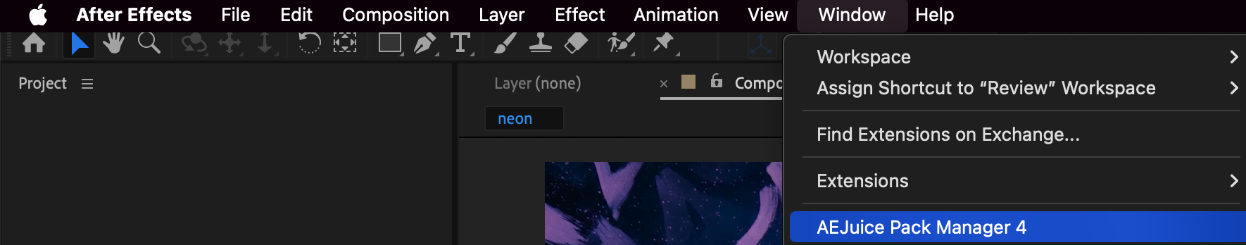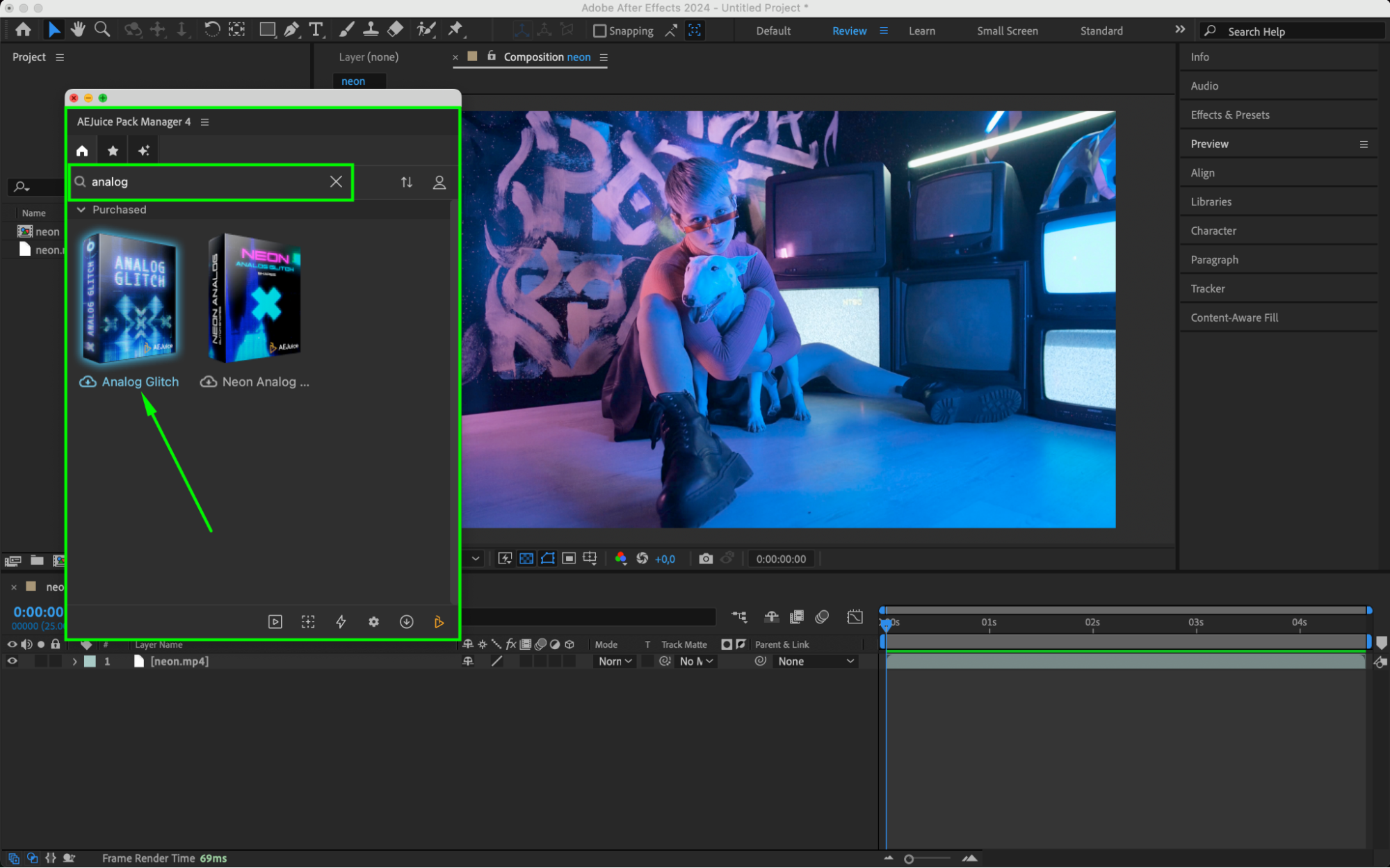 Navigate to Window > AEJuice Pack Manager 4 to open the plugin panel. From here, you can explore all the available AEJuice packs, including various glitch overlays and transitions.Step 3: Download the Analog Glitch Pack