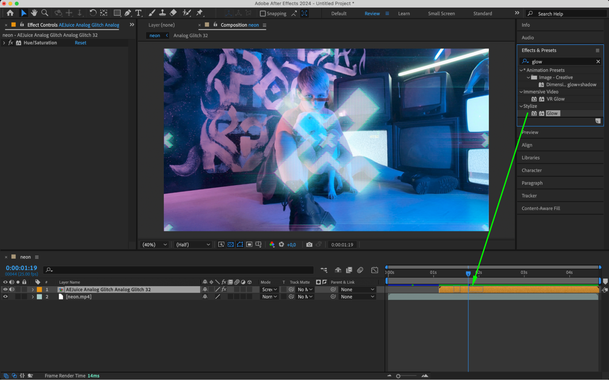 To make the glitch pop even more, add a Glow effect by going to Effects & Presets > Stylize > Glow. Adjust the settings like Glow Radius and Glow Intensity to get the desired impact. Step 7: Preview and Finalize
