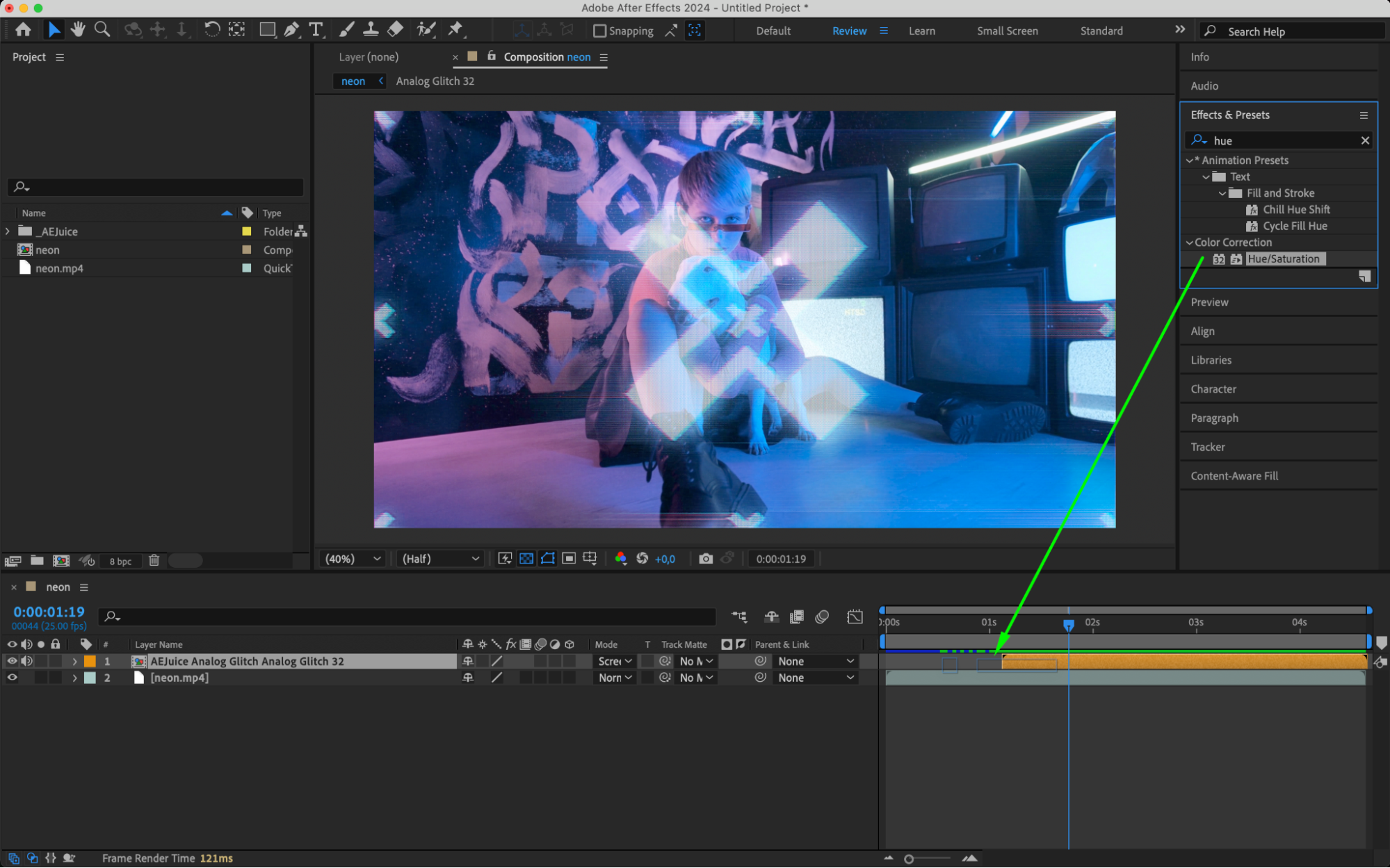 Go to the Effects & Presets panel and search for Hue/Saturation. Drag this effect onto the glitch layer. In the Effect Controls Panel, adjust the Master Hue to shift the colors and create a custom glitch style that fits your project’s mood.