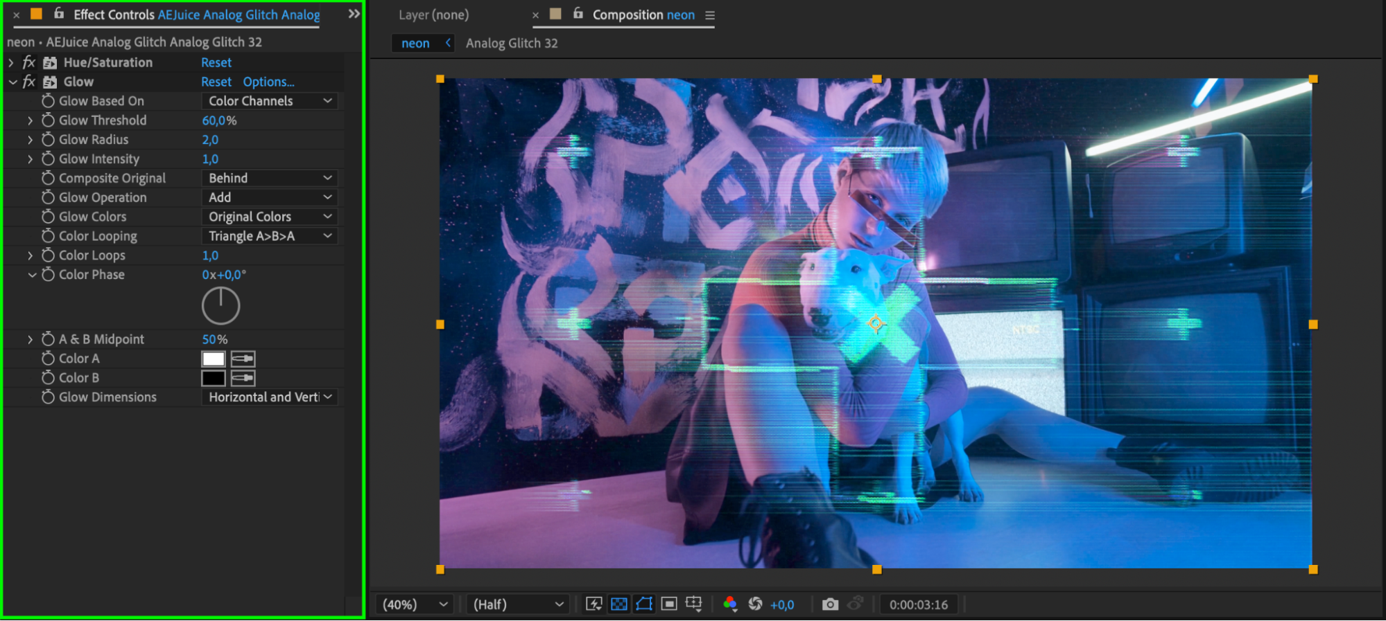 Analog glitch effects are one of the best overlays to create a retro and distorted video style. With the AEJuice Analog Glitch pack, you can easily add and customize high-quality analog distortions with just a few clicks. Use this analog glitch tutorial as a starting point and keep experimenting with color, glow, and layering to build your own signature look.