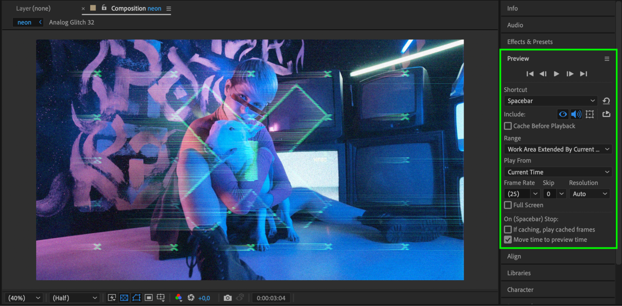Preview your video to check the timing and appearance of the analog glitch. Once everything looks good, export your video using Composition > Add to Render Queue.