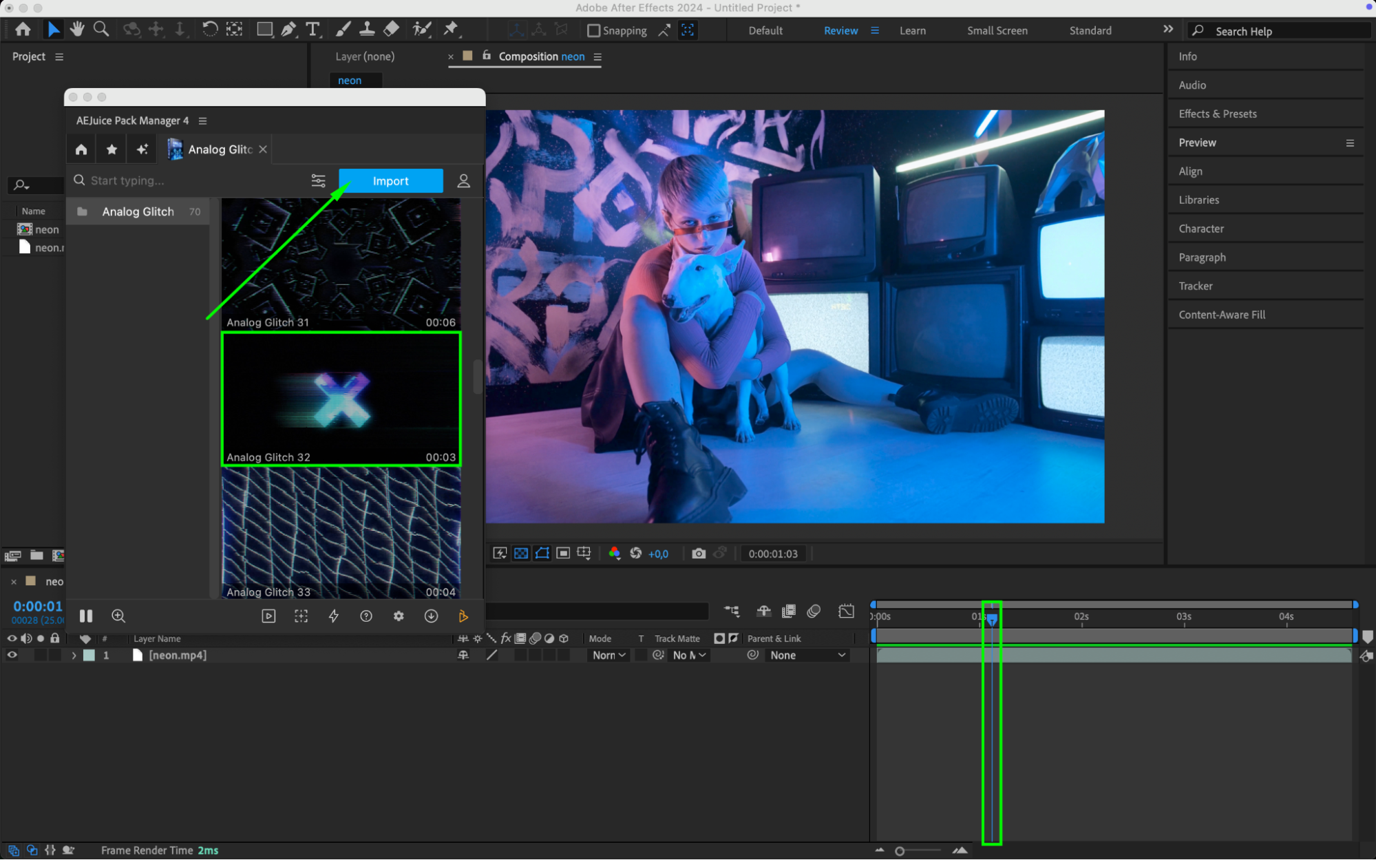 Browse through the glitch templates in the pack and pick the one that fits your project. Click on the animation you like and press the Import button. A new pre-composition, such as Analog Glitch 32, will appear in your timeline.