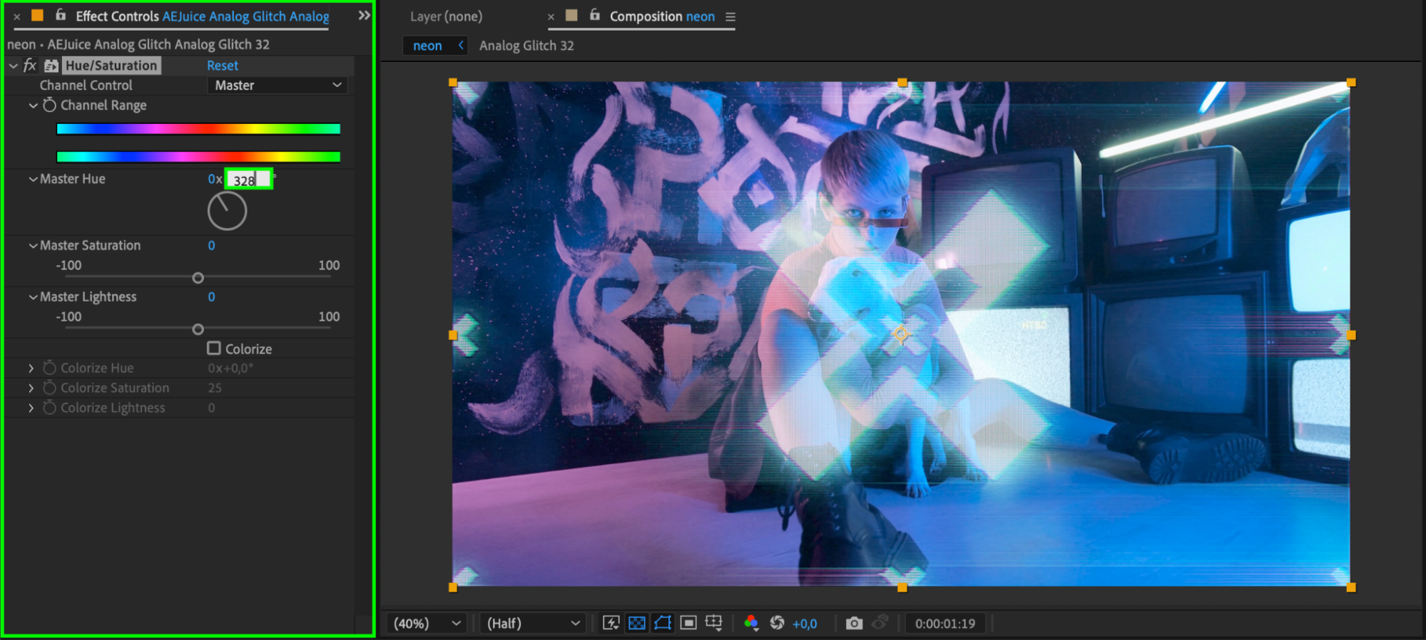 Step 5: Customize Glitch Color with Hue & Saturation (Optional)