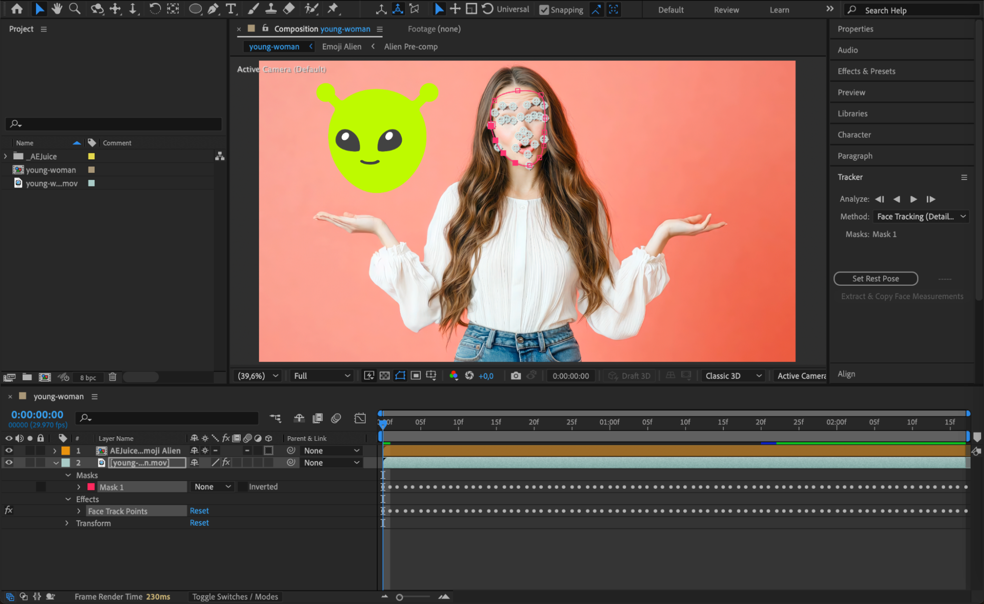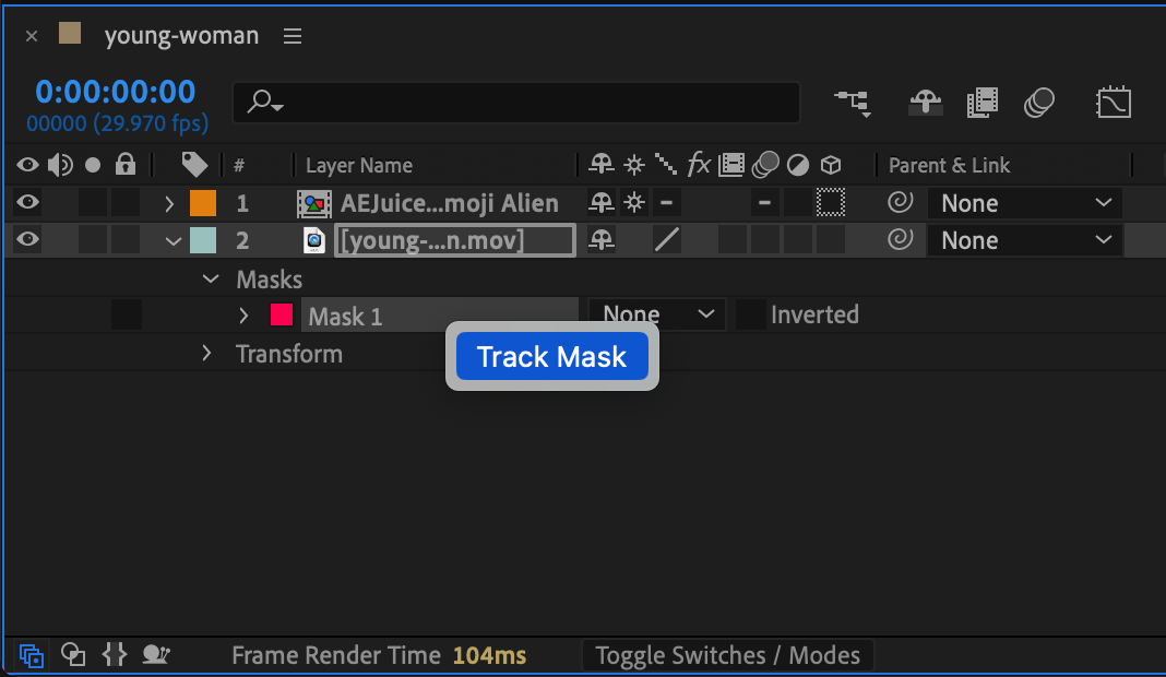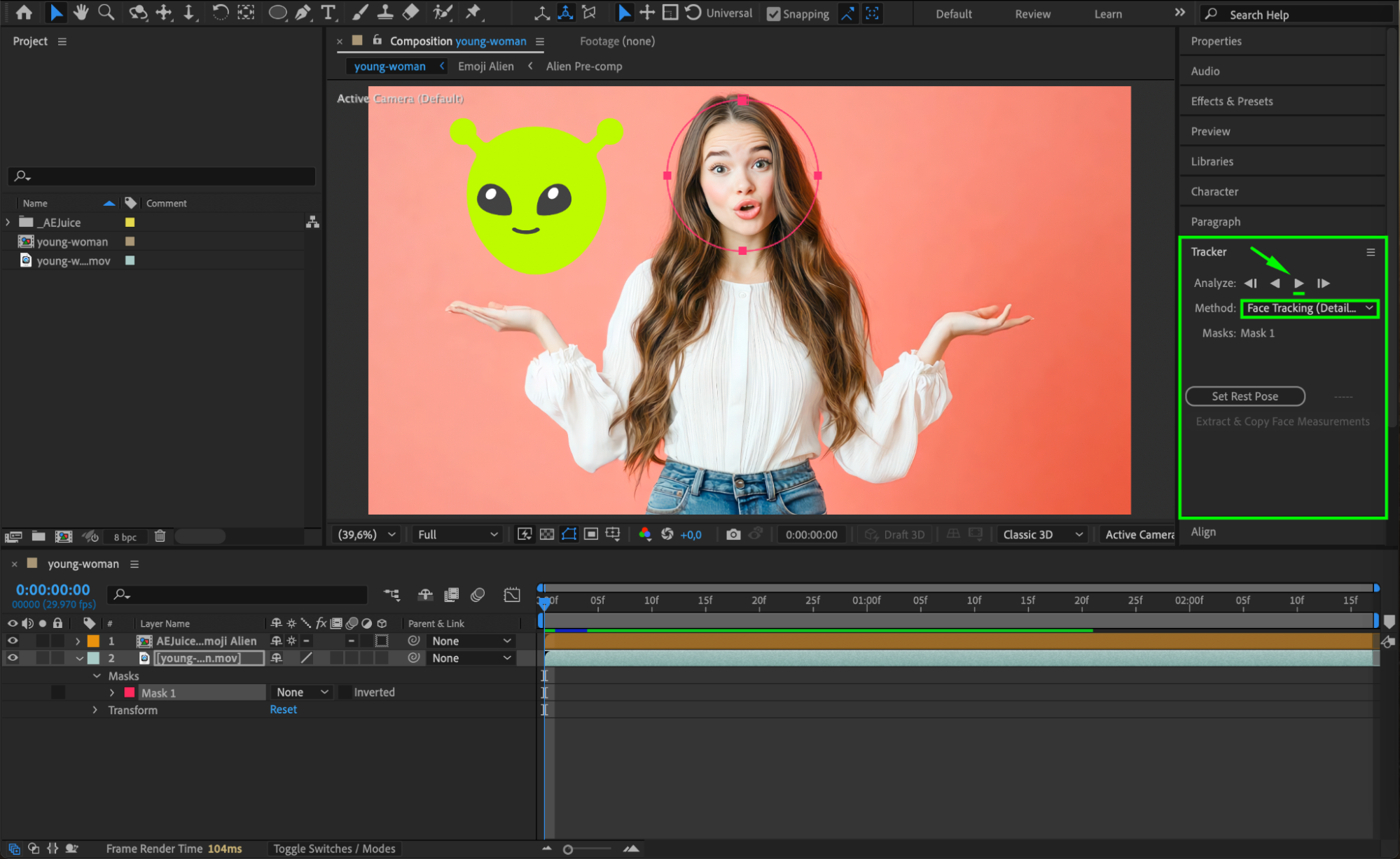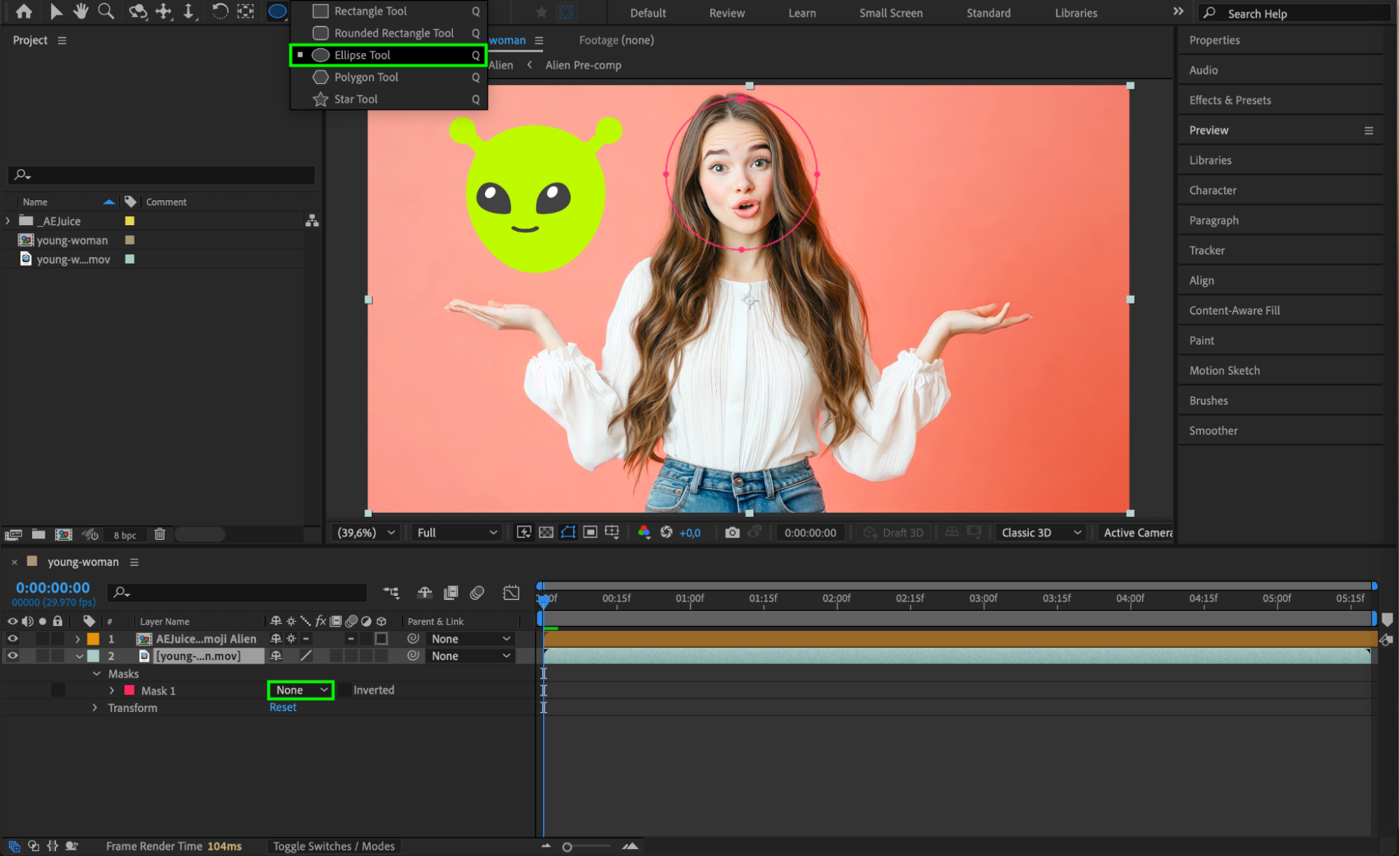 If you want your emoji to follow something in the video (like a person’s head), use the Ellipse Tool (Q) to draw a mask around the face on your footage. Set the Mask Mode to None.
