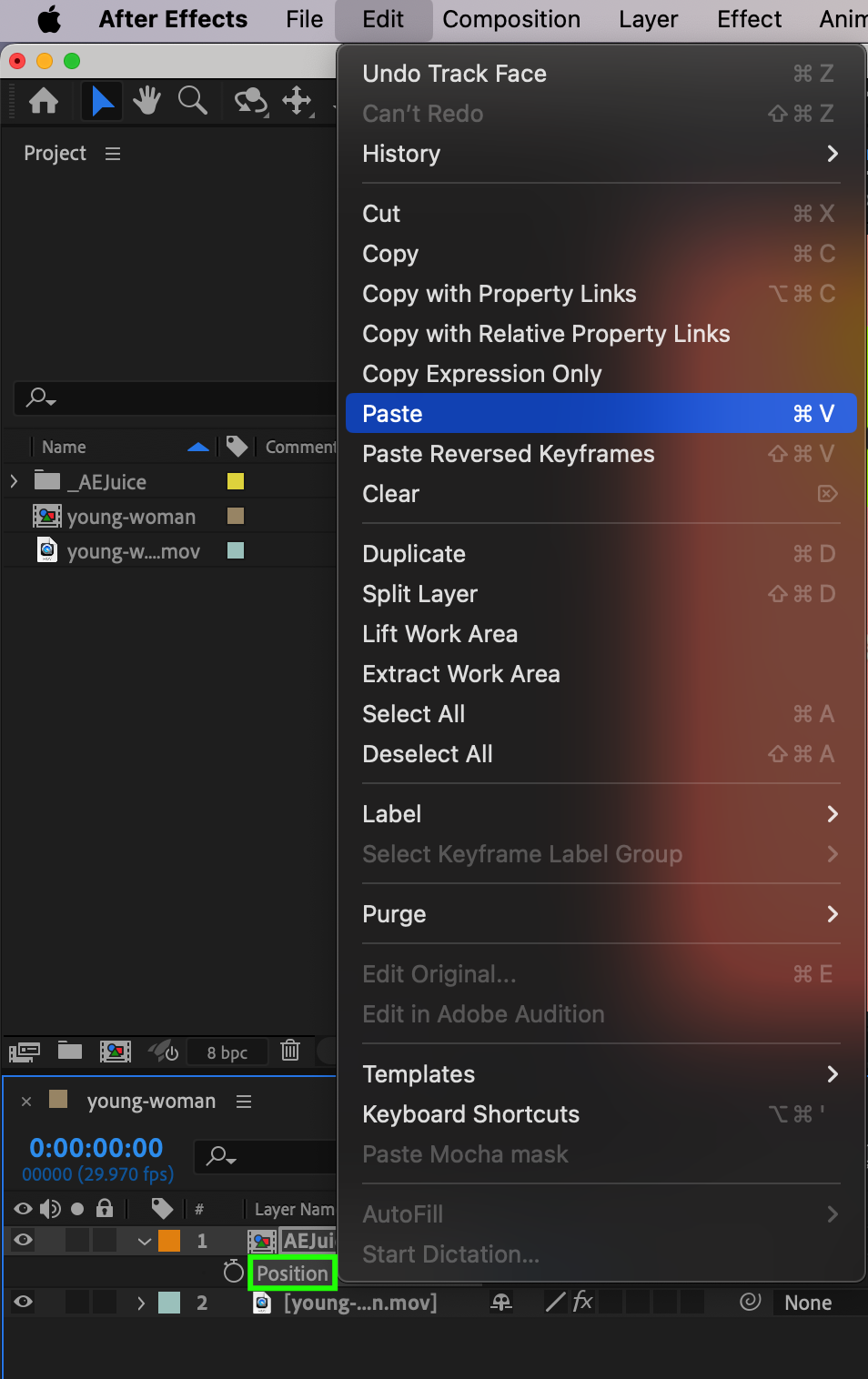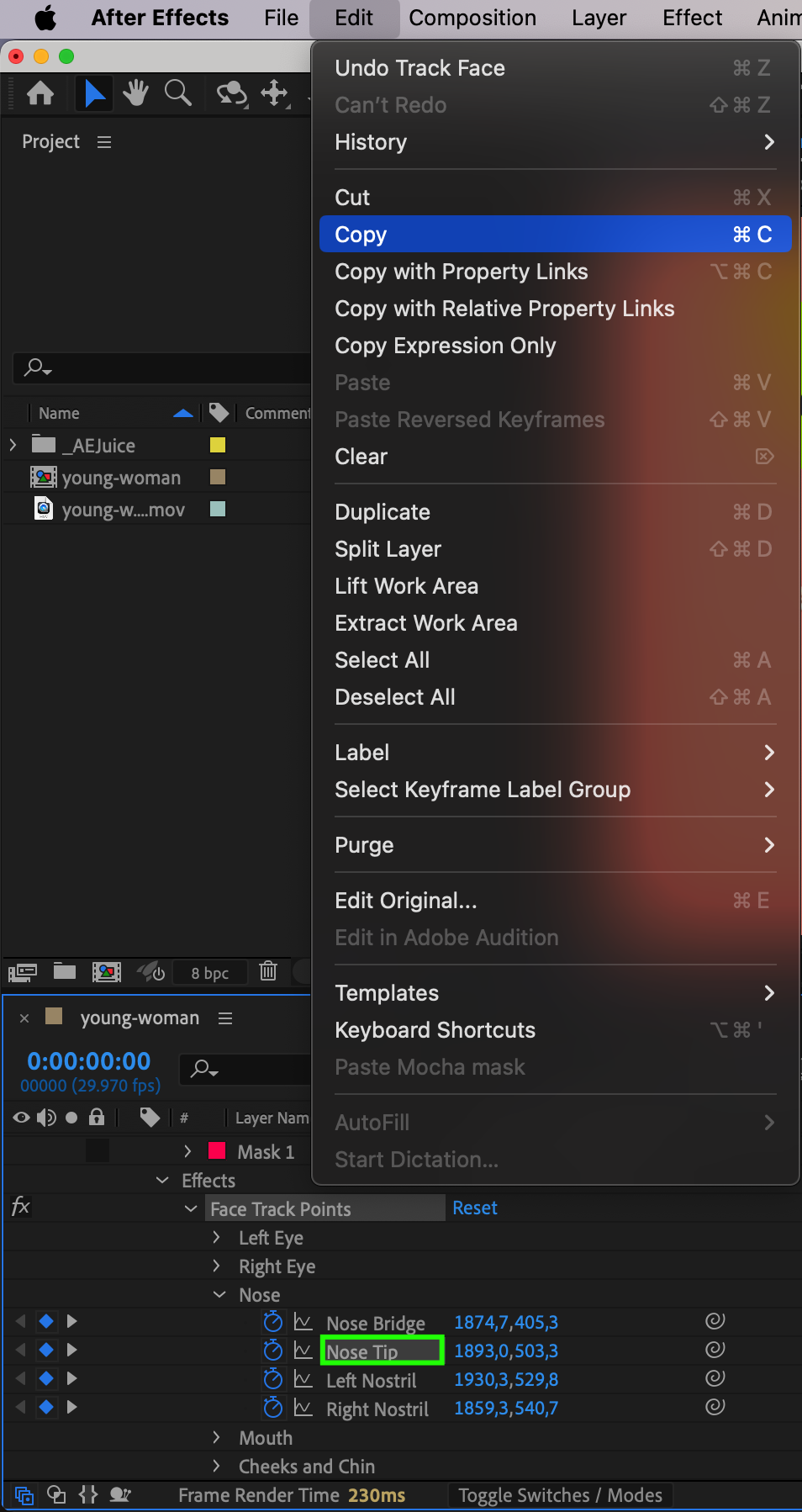 After the tracking is complete, find the tracking point labeled “Nose Tip”. Copy the Nose Tip tracking data, then go to your emoji pre-comp layer and paste it into the Position property. This attaches the emoji to follow the motion of the face. Adjust the scale and position to fit naturally.