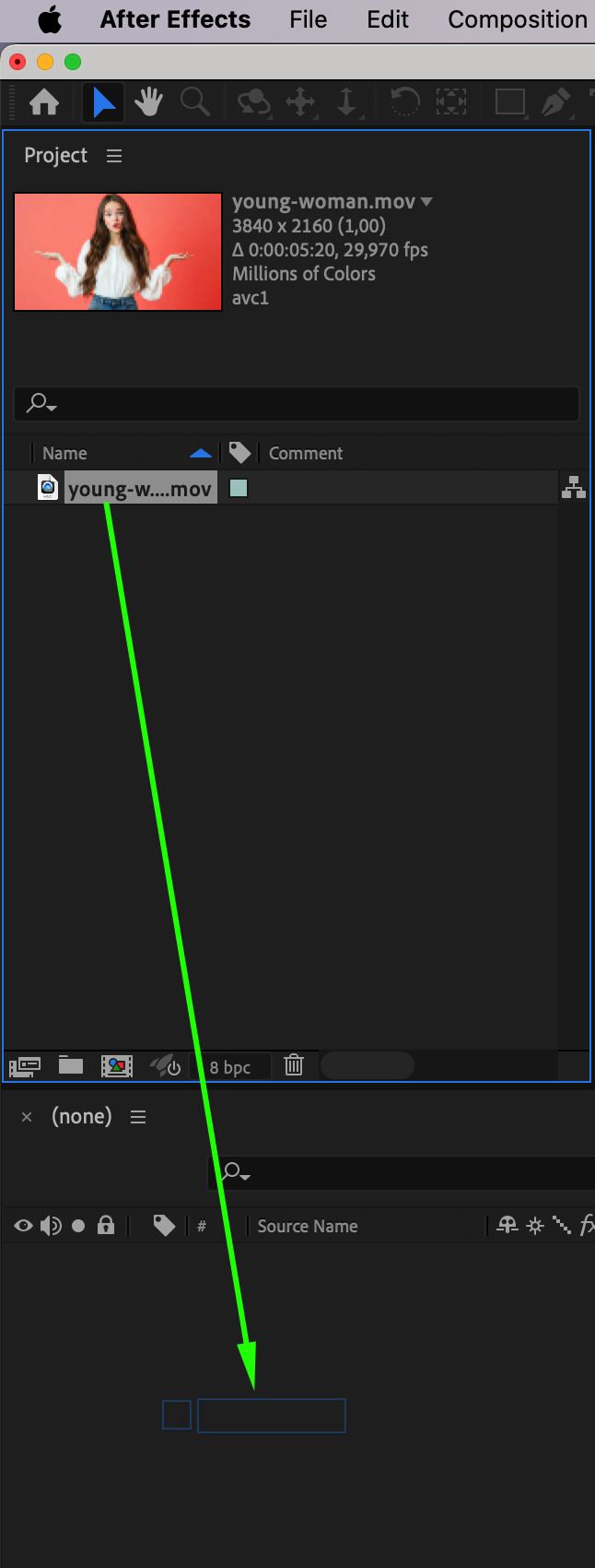 Start by going to File > Import > File, and select your video clip. Drag the footage into the timeline to create a new composition. This composition will serve as your base for adding emojis.