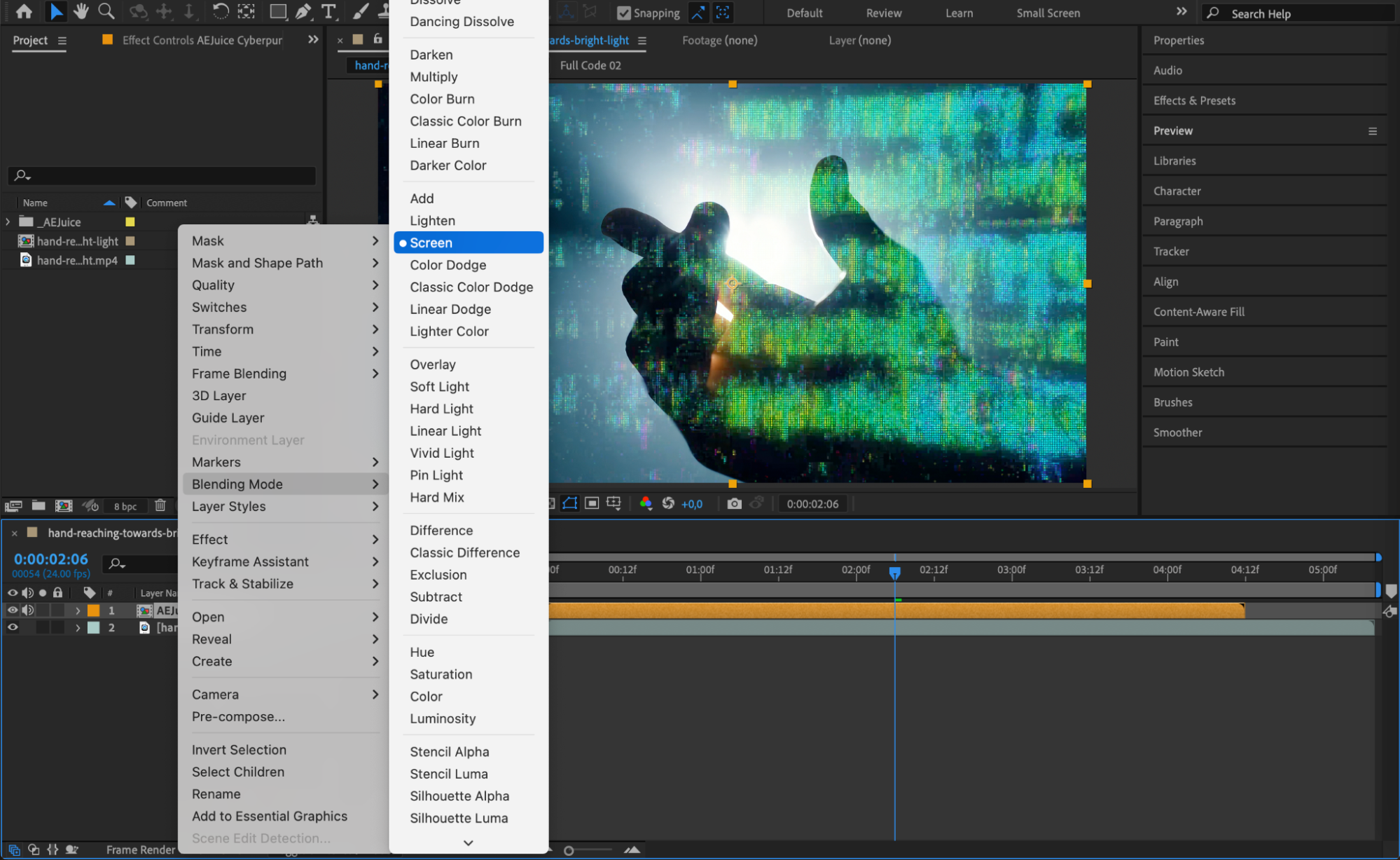 In your timeline, place the glitch texture above your footage layer. Then right-click on the texture layer and go to Blending Mode > Screen. This removes black areas and blends the texture seamlessly over your video.