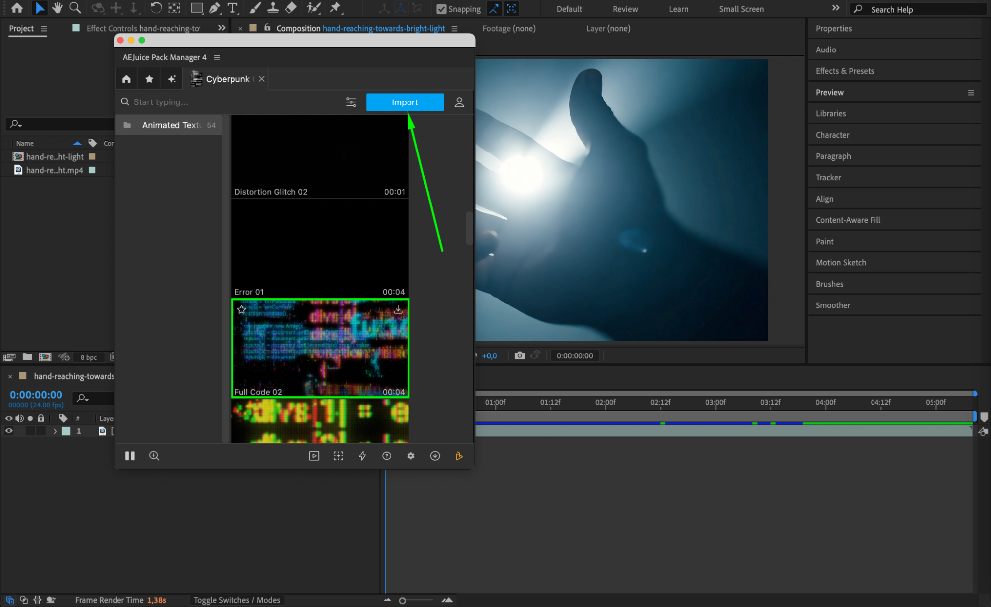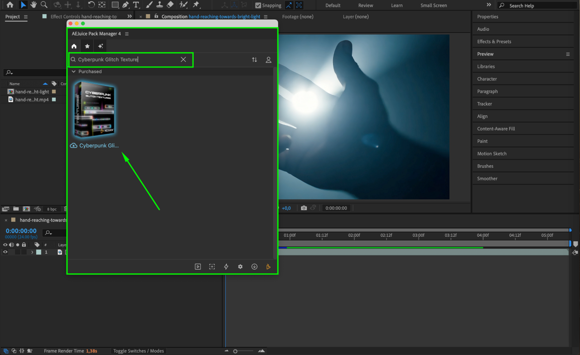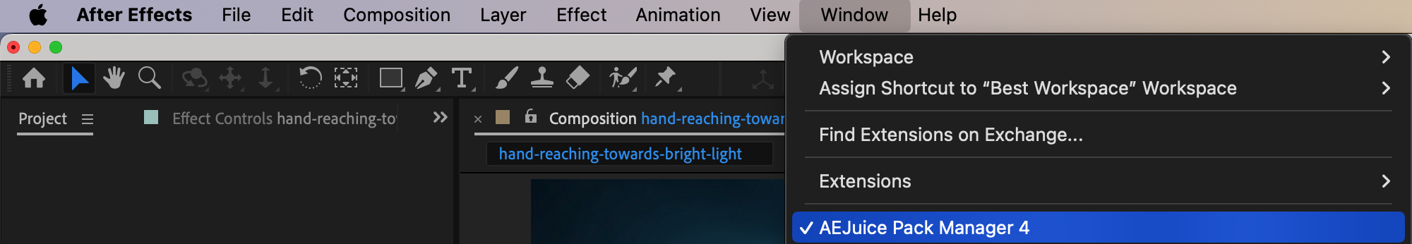 Go to Window > AEJuice Pack Manager 4 to launch the plugin panel. This tool gives you access to all your AEJuice packs, including Cyberpunk textures.