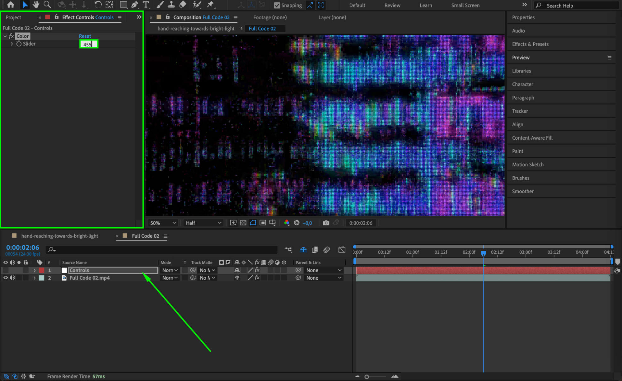 Double-click on the imported pre-comp to open it. Select the Controls layer and open the Effect Controls Panel. Adjust the Slider controls to change the glitch color and intensity directly in your preview window.