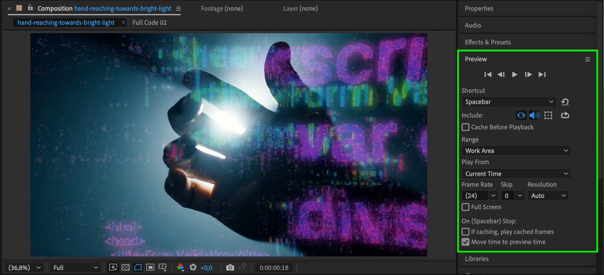 Press Spacebar to preview your animation and make final adjustments. You can duplicate the glitch texture layer, offset the timing, or add additional color grading for a more complex Cyberpunk look.Conclusion