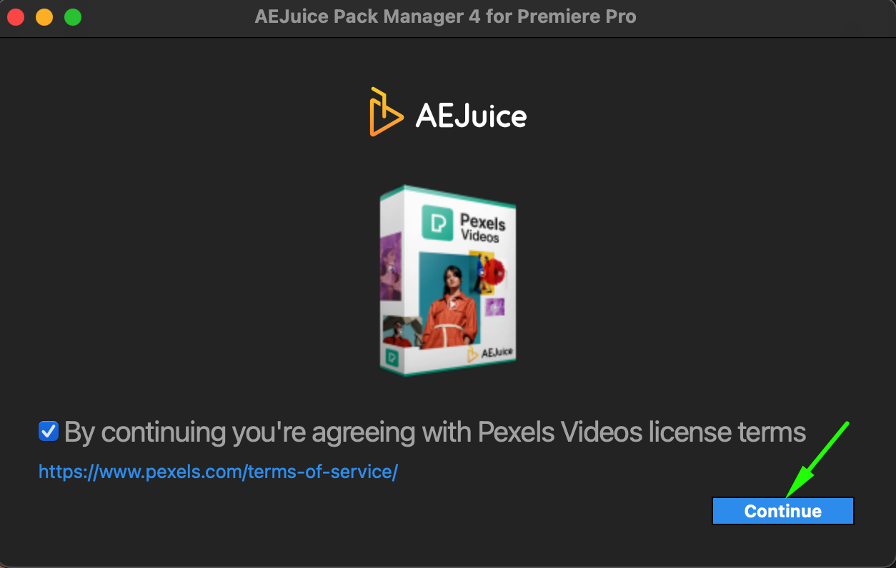 Read the license terms for using Pexels content. If you agree, check the box next to “By continuing you are agreeing with Pexels videos license terms” and press Continue to proceed.