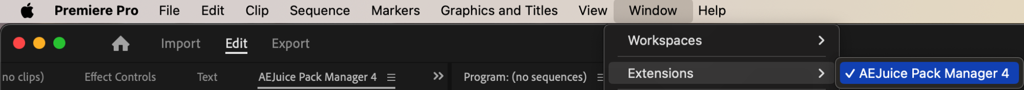 Go to Window > Extensions > AEJuice Pack Manager 4 to open the plugin panel. This is where you’ll find all available AEJuice packs, including the Pexels video library.